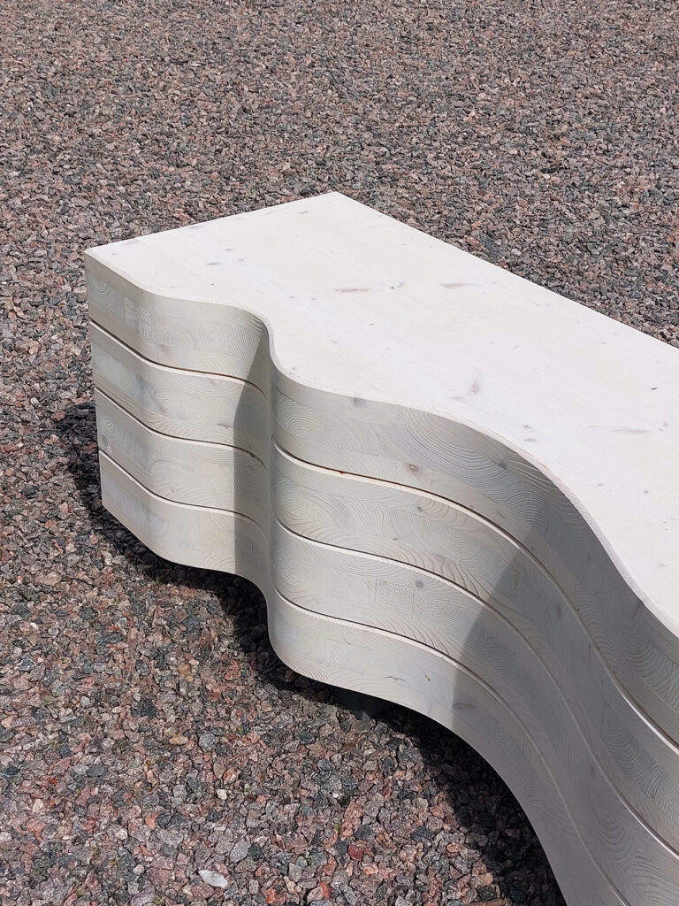 CLT-pientuotteet valmistetaan kotimaisesta kuusesta ja levyjen yleisin vahvuus on 90-100 mm. Ristiin liimattu puulevy kestää hyvin ulkokäytössä, mutta sen pintaan ilmaantuu ajan myötä usein pieniä halkeamia sekä luonnollista kulumaa ja patinoitumista. Nämä muutokset eivät vaikuta tuotteiden käytettävyyteen ja massiivipuuta voi myös hioa ja huoltokäsitellä pidentäen niiden käyttöikää.