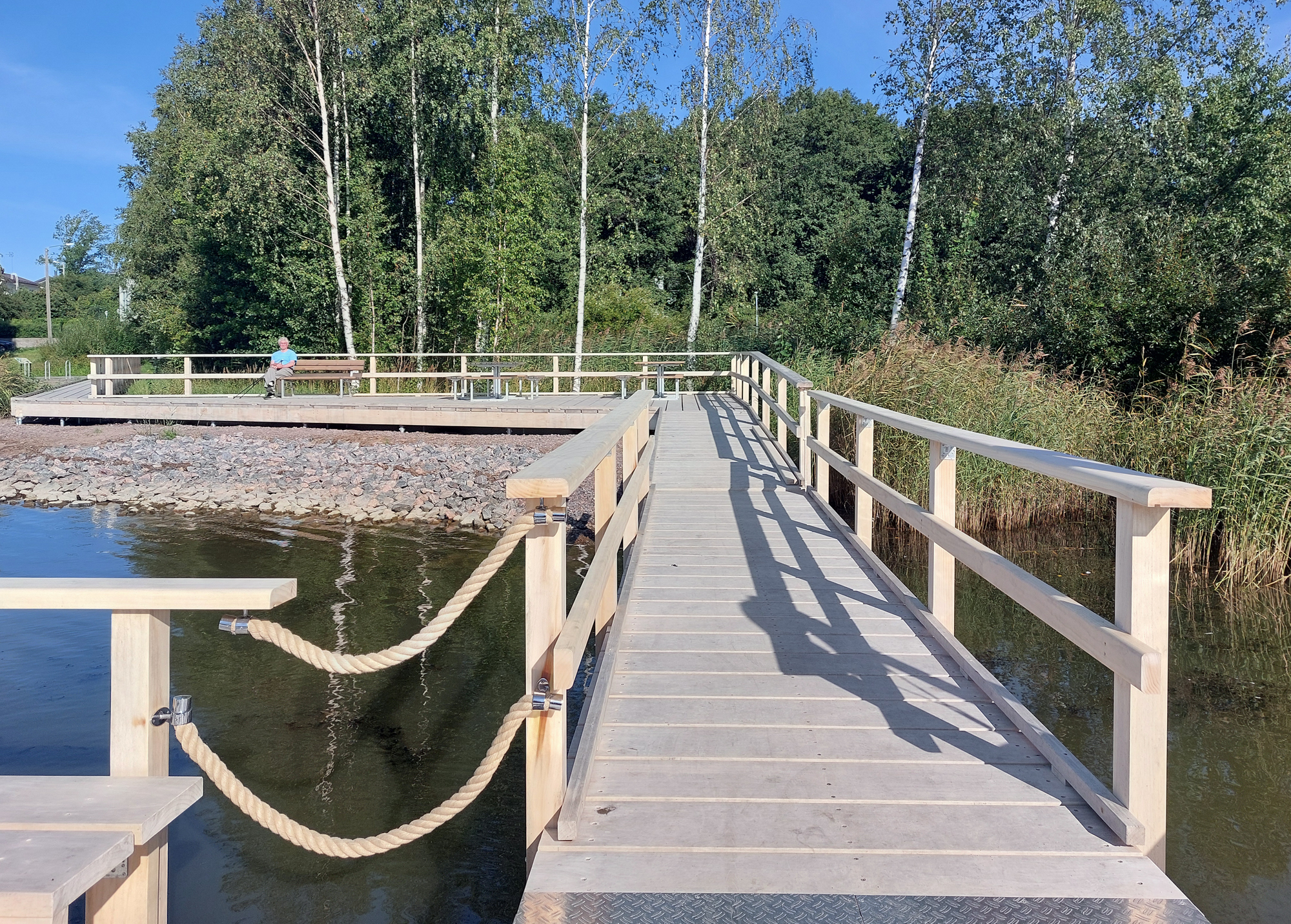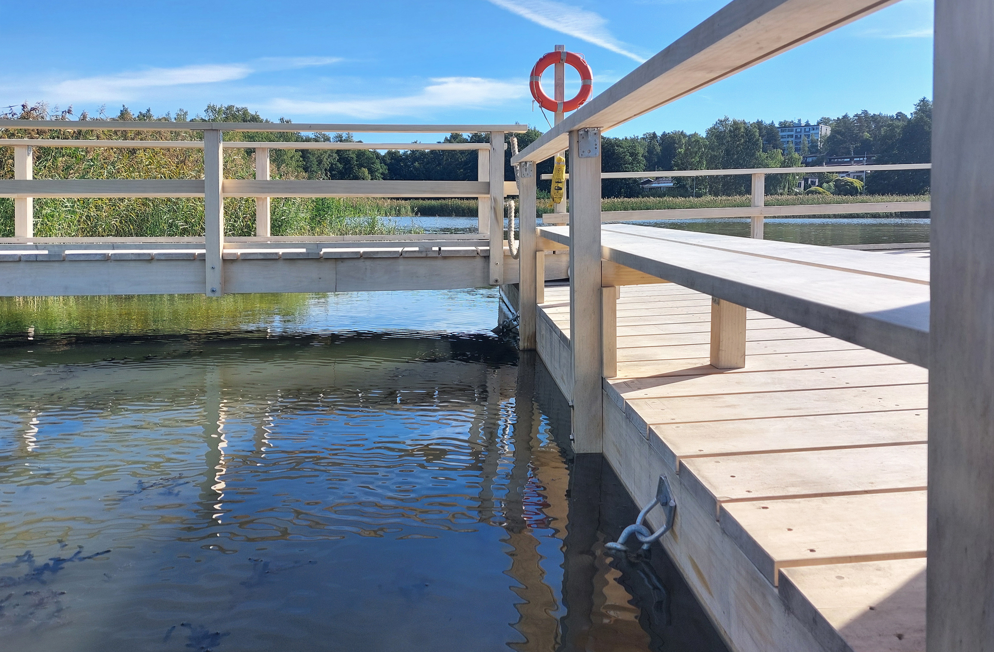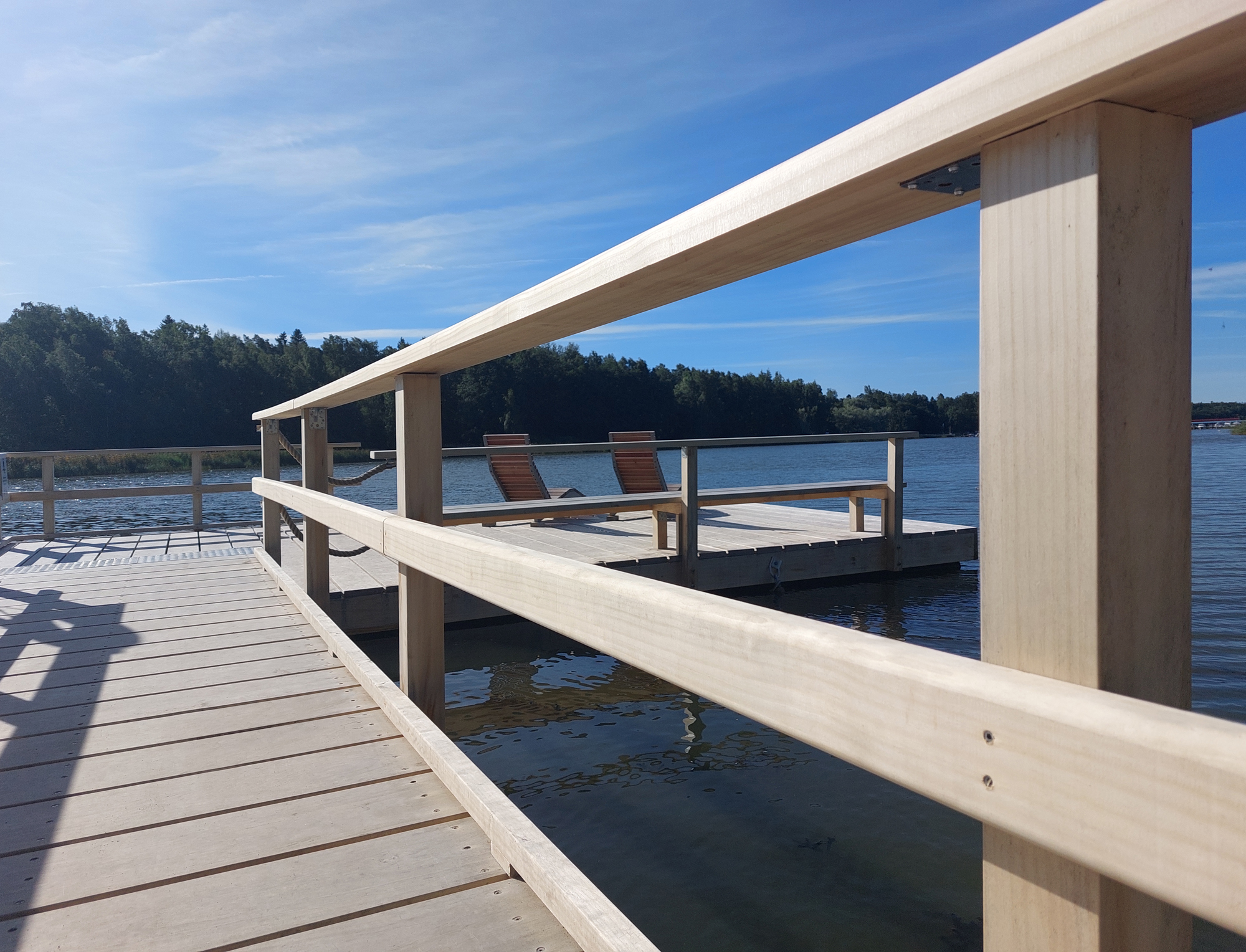Helsingin Vartiokylänlahden rantaan valmistui kesällä 2024 upea Accoya -puinen oleskelulaituri. Myrkytön Accoya on varma valinta meren rannalle luonnon läheisyyteen, jossa puulta vaaditaan erityisen hyvää kestävyyttä. Julkisessa käytössä puurakenteiden tulee olla myös helposti huollettavia ja puumateriaalin turvallisen tikutonta. Laiturin 245 mm leveät kansilaudat ovat tukevat astella ja antavat kokonaisuudelle arvokkaan ilmeen. Käsijohteiden alapintoihin työstettiin urat led-valonauhoille, jotka valaisevat kulkuväylän iltojen pimentyessä.