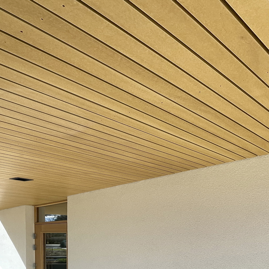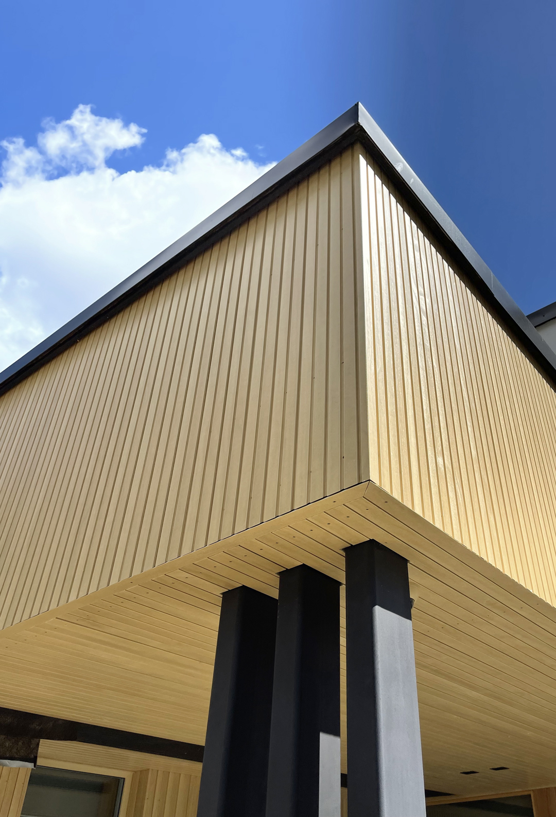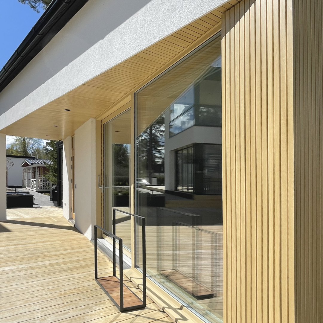 Tässä modernissa pientalossa Accoya terassit ja puuverhoukset ovat pintakäsitelty vaalean okran sävyllä.