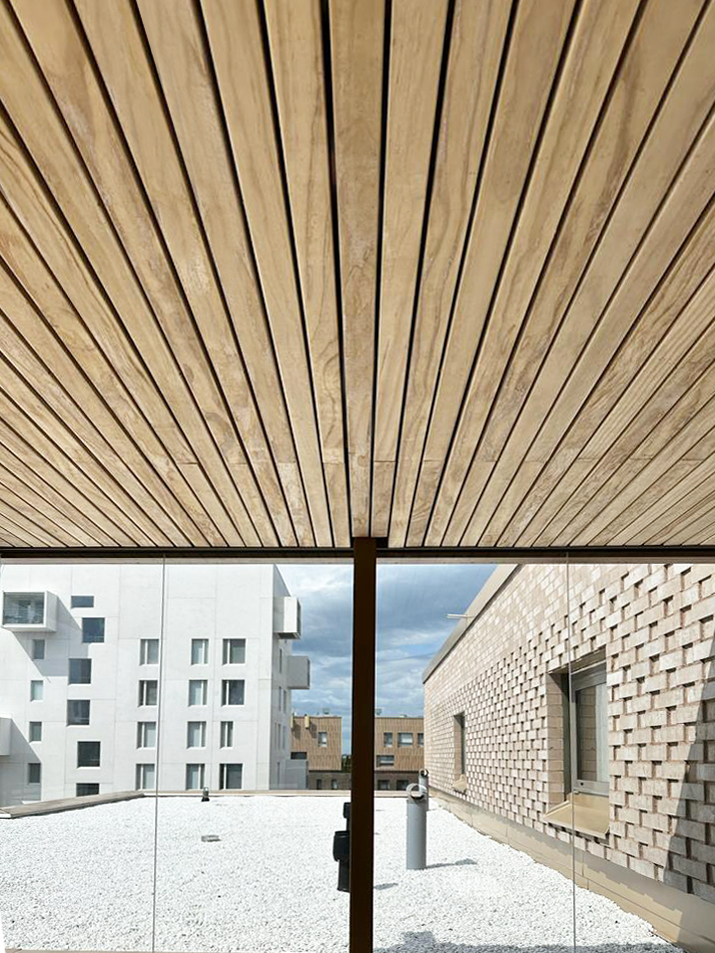 Kohteen sisäänkäynneissä on käytetty lisäksi Novenbergin Colima-maatiiliä, ja valikoiduissa osin julkisivujen puuverhouksia ja alakattoja on palonsuojattuja Accoya-paneeleita.