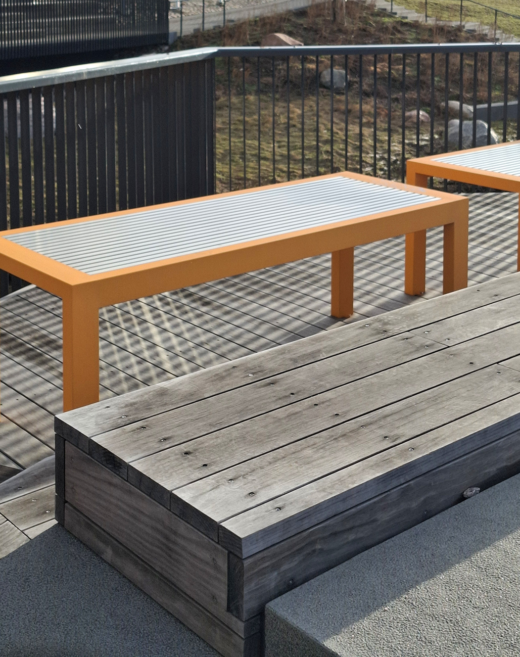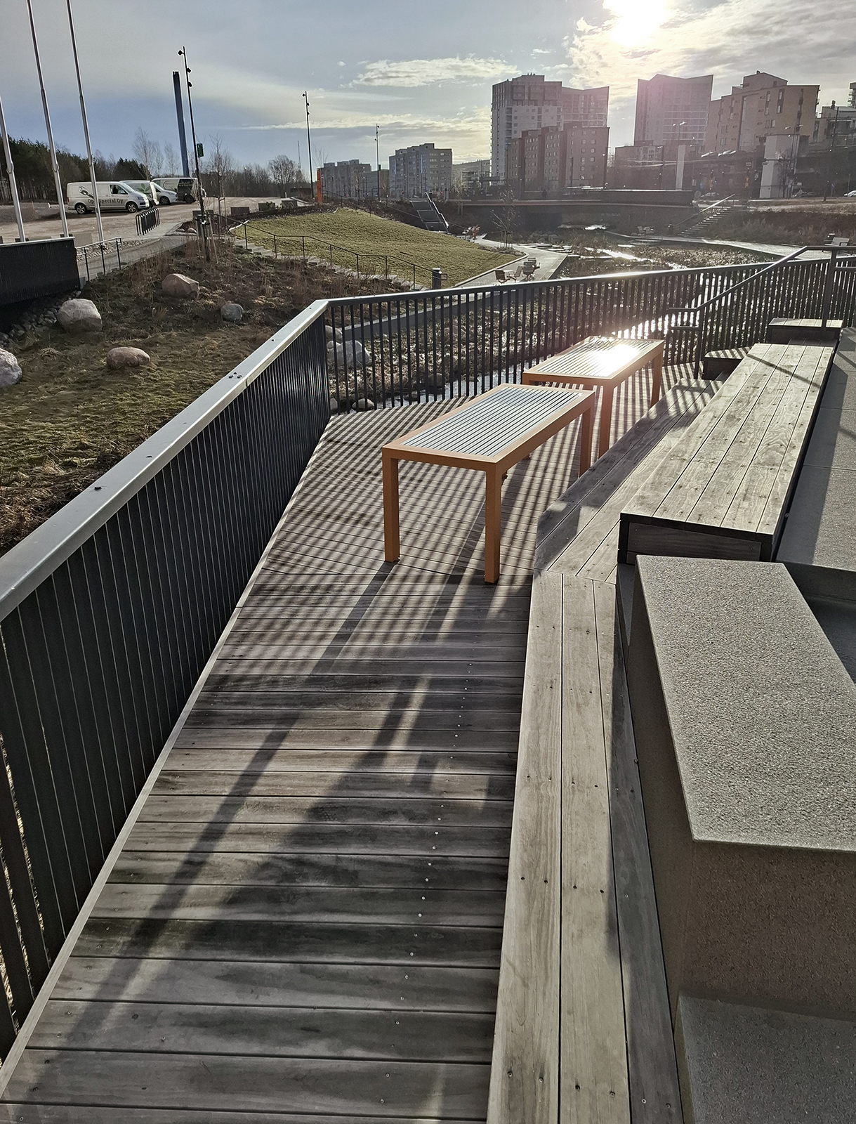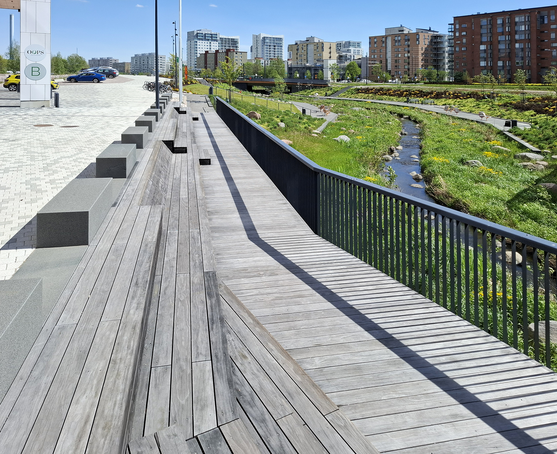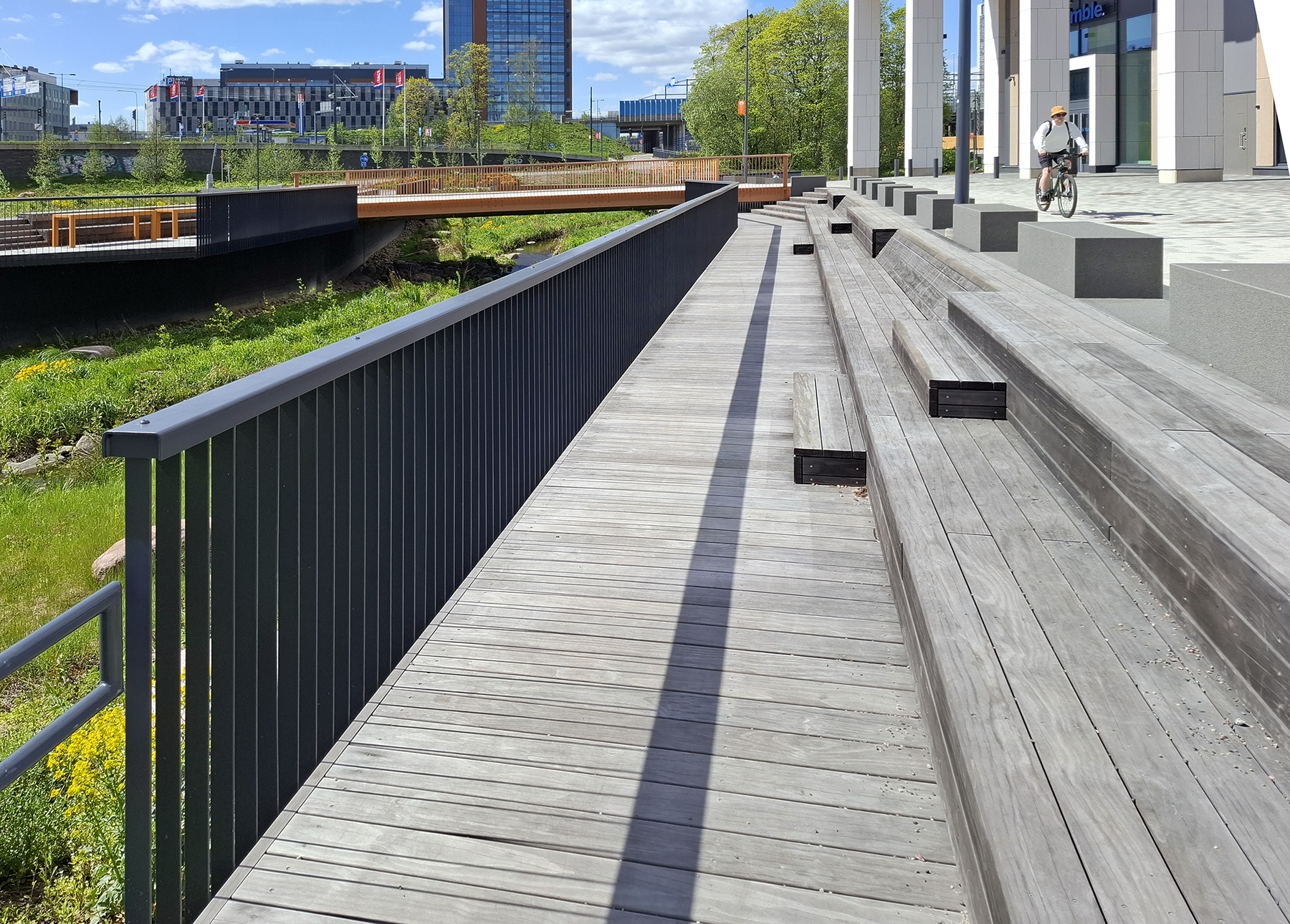 Puistoalueen puuterassit ja oleskelutasanteet on toteutettu Novenbergin toimittamasta ekologisesti modifioidusta Kebony® -puutavarasta. Kebony on biopohjainen puun modifiointimenetelmä, joka tekee puusta erittäin kovaa ja säänkestävää. Puumateriaali ei vaadi asennuksen jälkeen pintakäsittelyä tai vuosittaista huoltokäsittelyä, jolla voidaan minimoida puurakenteiden ylläpitokustannukset vuosiksi eteenpäin. Terassien rakennepuina on käytetty Kebony Character laatua, jonka raaka-aineena on pohjoisen mänty. Kansilaudoitukseen valittiin tyylikäs Kebony Clear, joka valmistetaan lähes oksattomasta radiata männystä. Kebony on uutena väriltään ruskeaa ja puu patinoituu ajan myötä harmaaksi.
