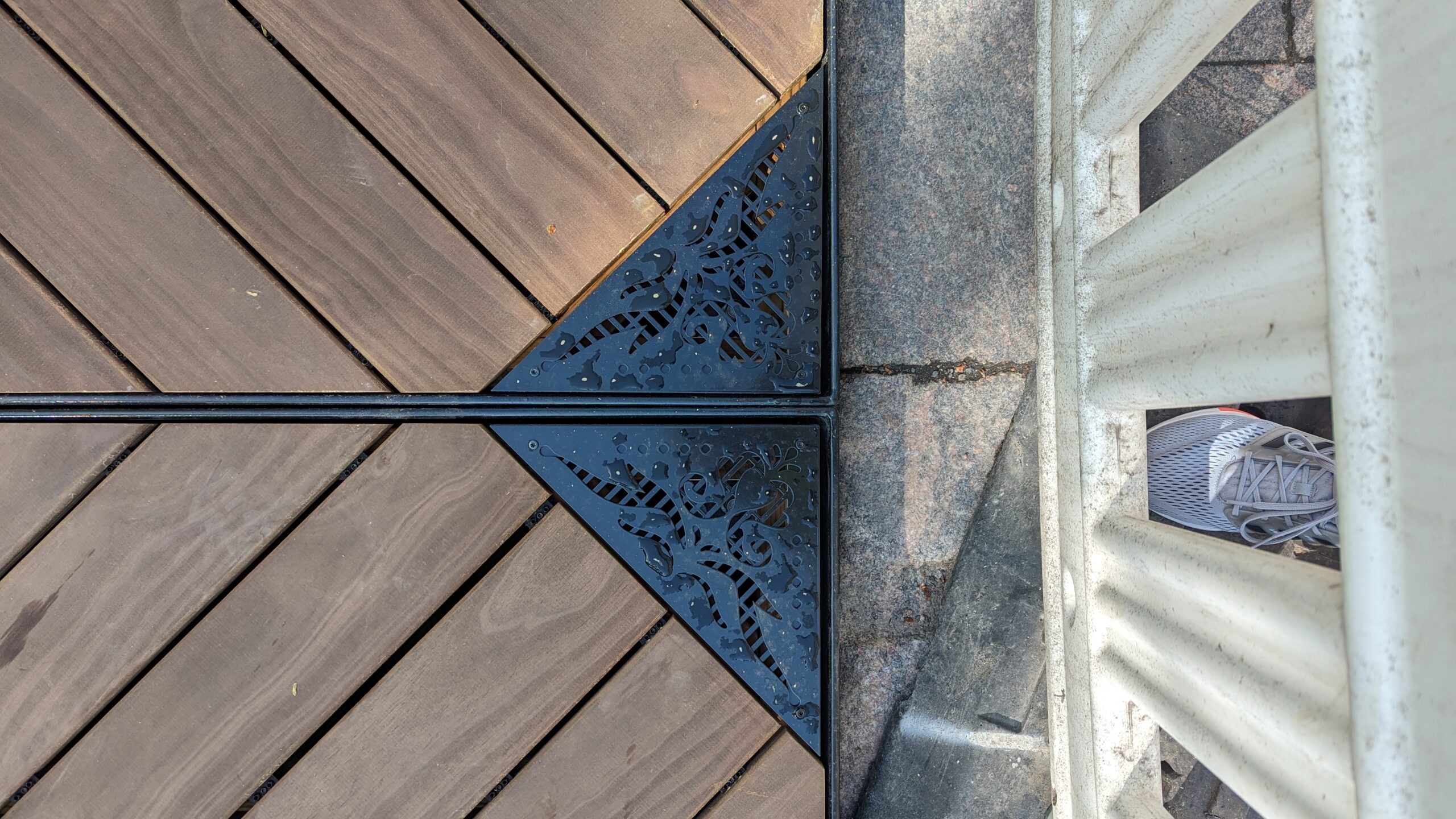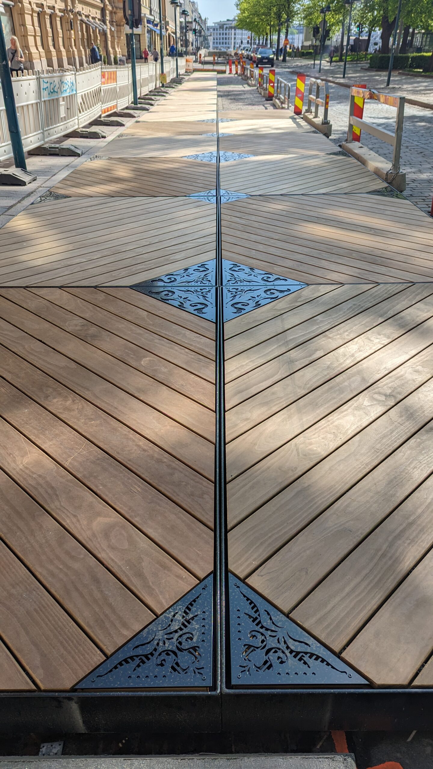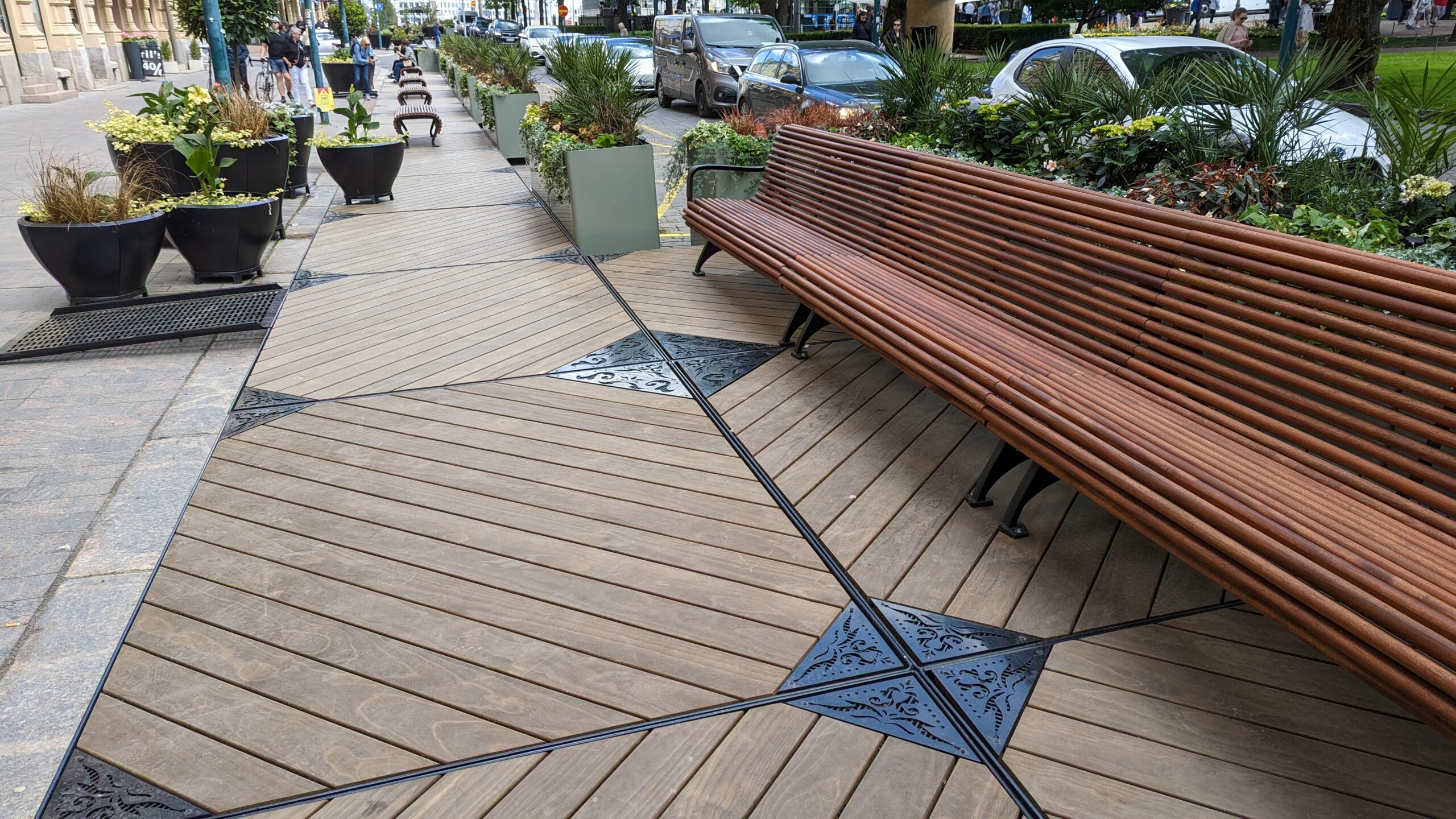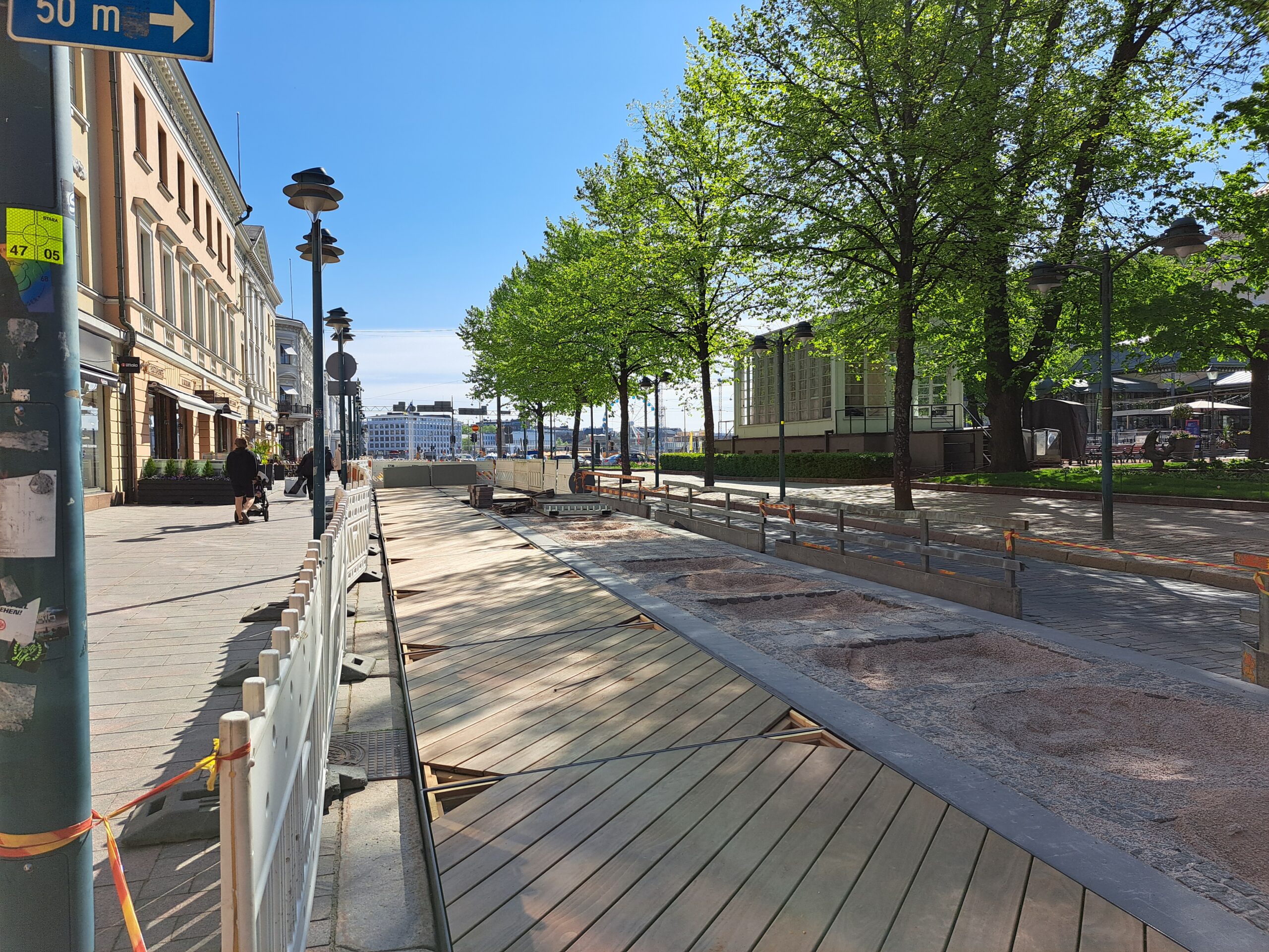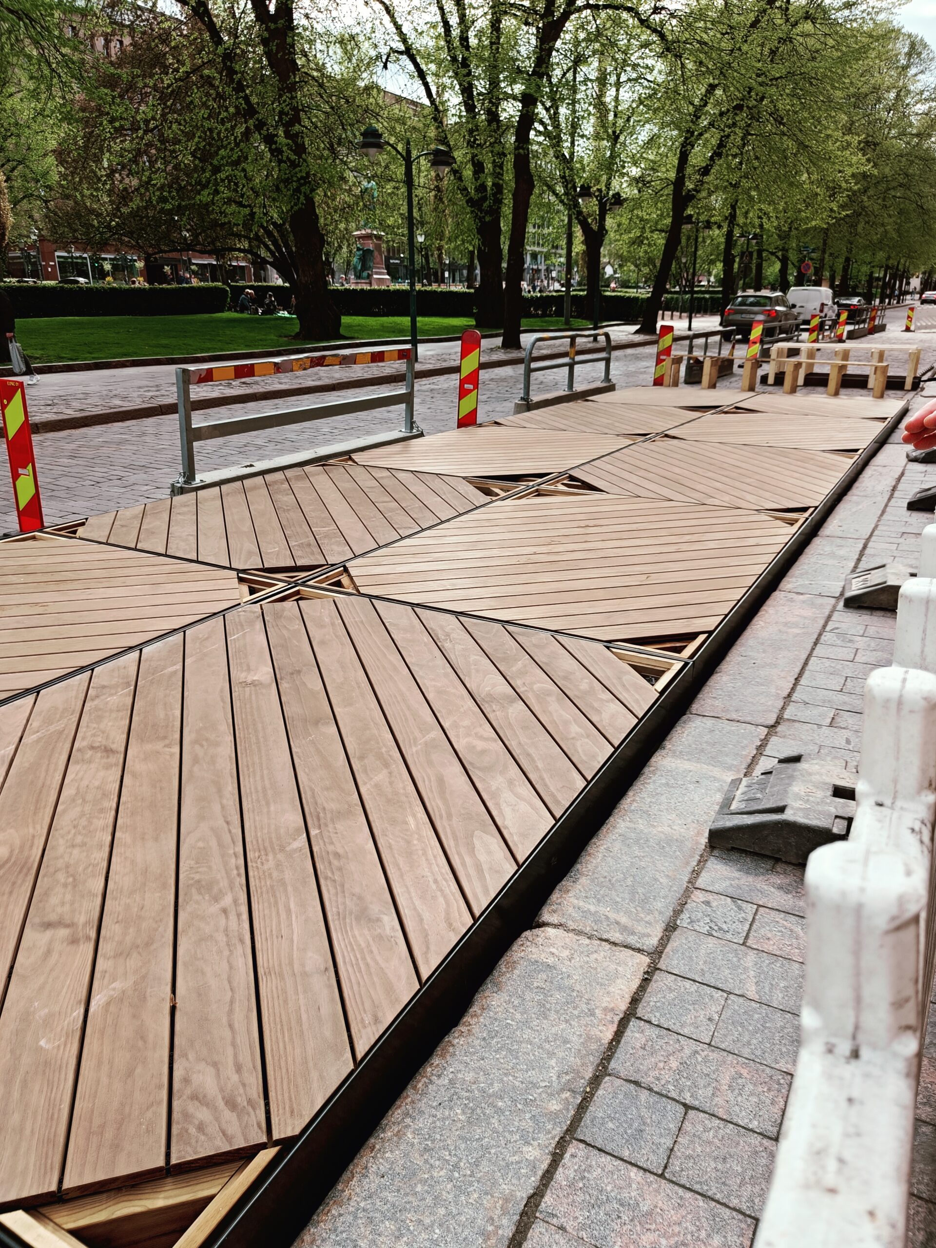Laajennusalueiden pohjat toteutettiin luonnonkivi- ja puupinnoittein. Kivipintaan Pohjoisesplanadilla käytettiin samaa kotimaista graniittia kuin olemassa olevat jalkakäytävät. Korotettuja puuterasseja rakennettiin kohtiin, joissa sadevesien tuli päästä vapaasti virtaamaan rakenteen alla. Esplanadille varta vasten suunniteltujen terassielementtien Kebony-puupintaa koristi parkettimainen kuvio ja metalliset yksityiskohdat. Tummien teräskoristeiden muotoilussa näkyi ympäröivien rakennusten detaljiikka. Katukokeilun jälkeen terassielementtejä voi käyttää parklet-ratkaisuna.