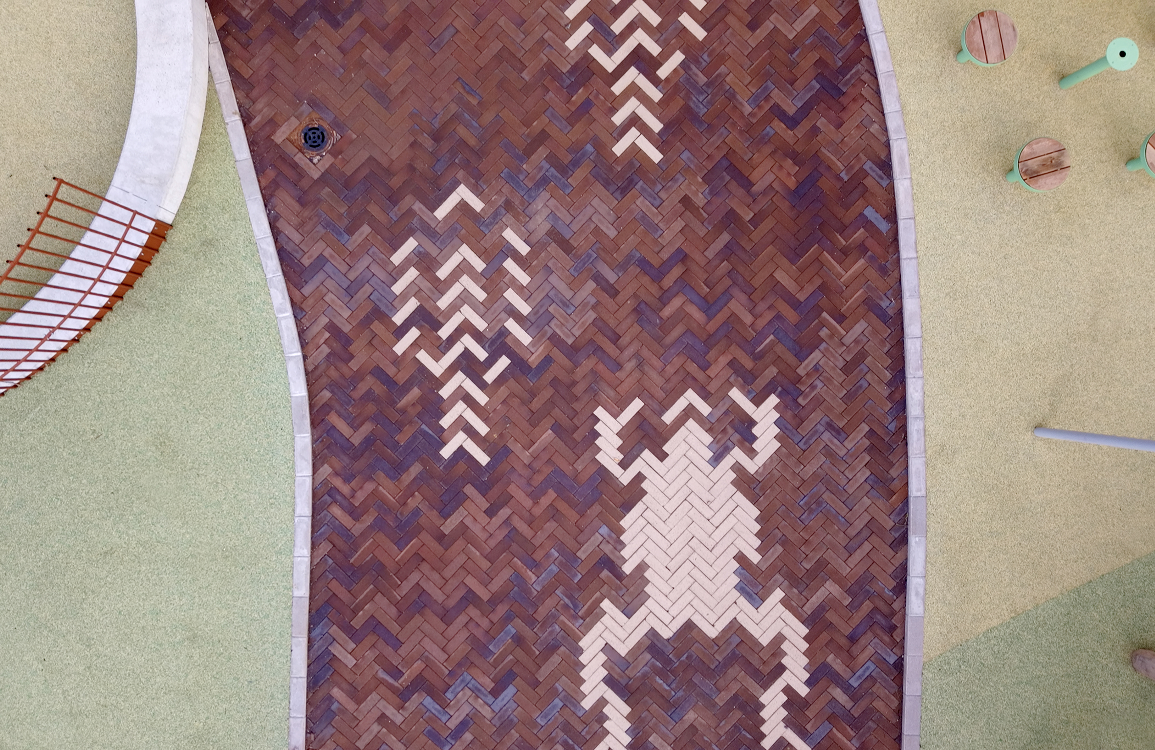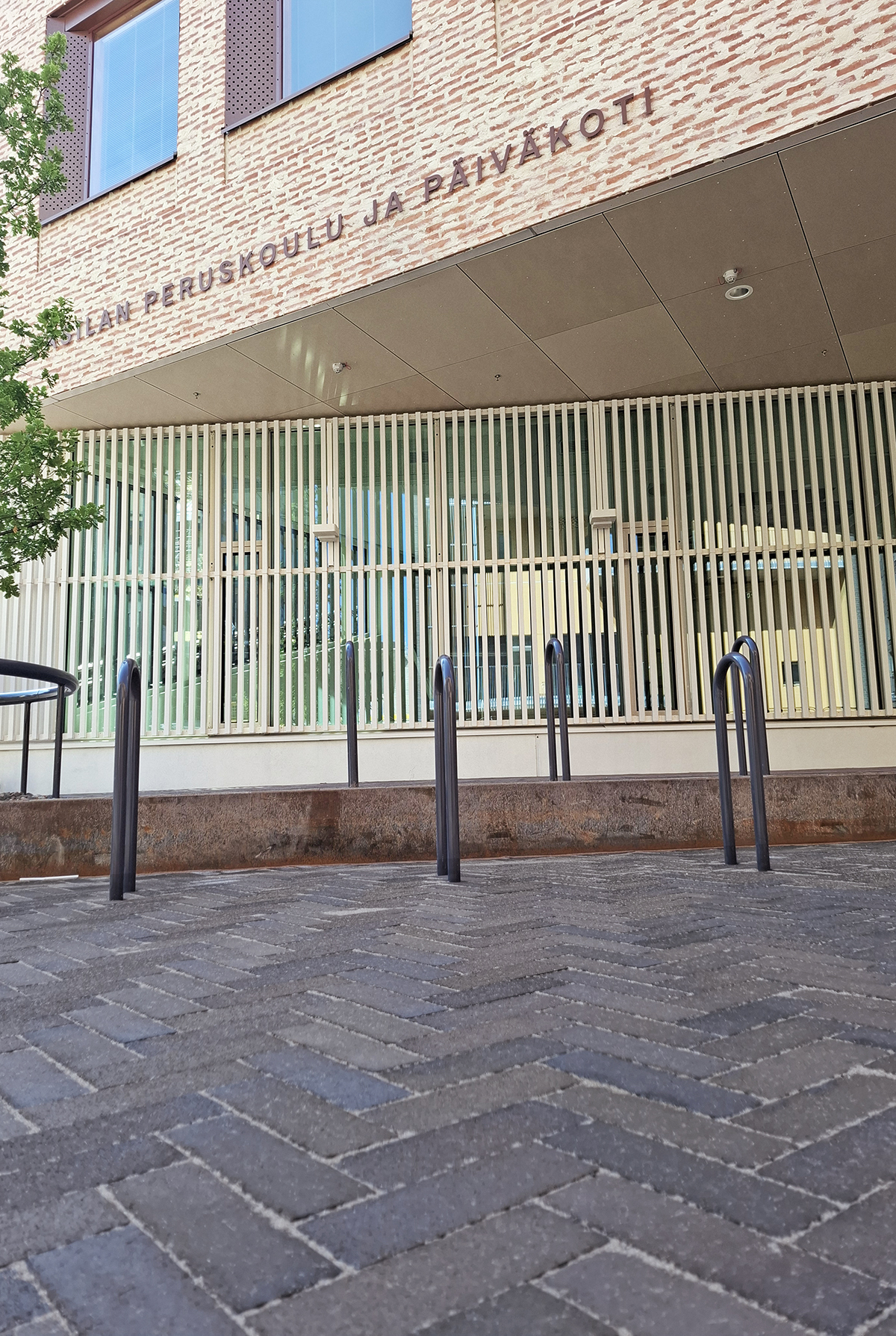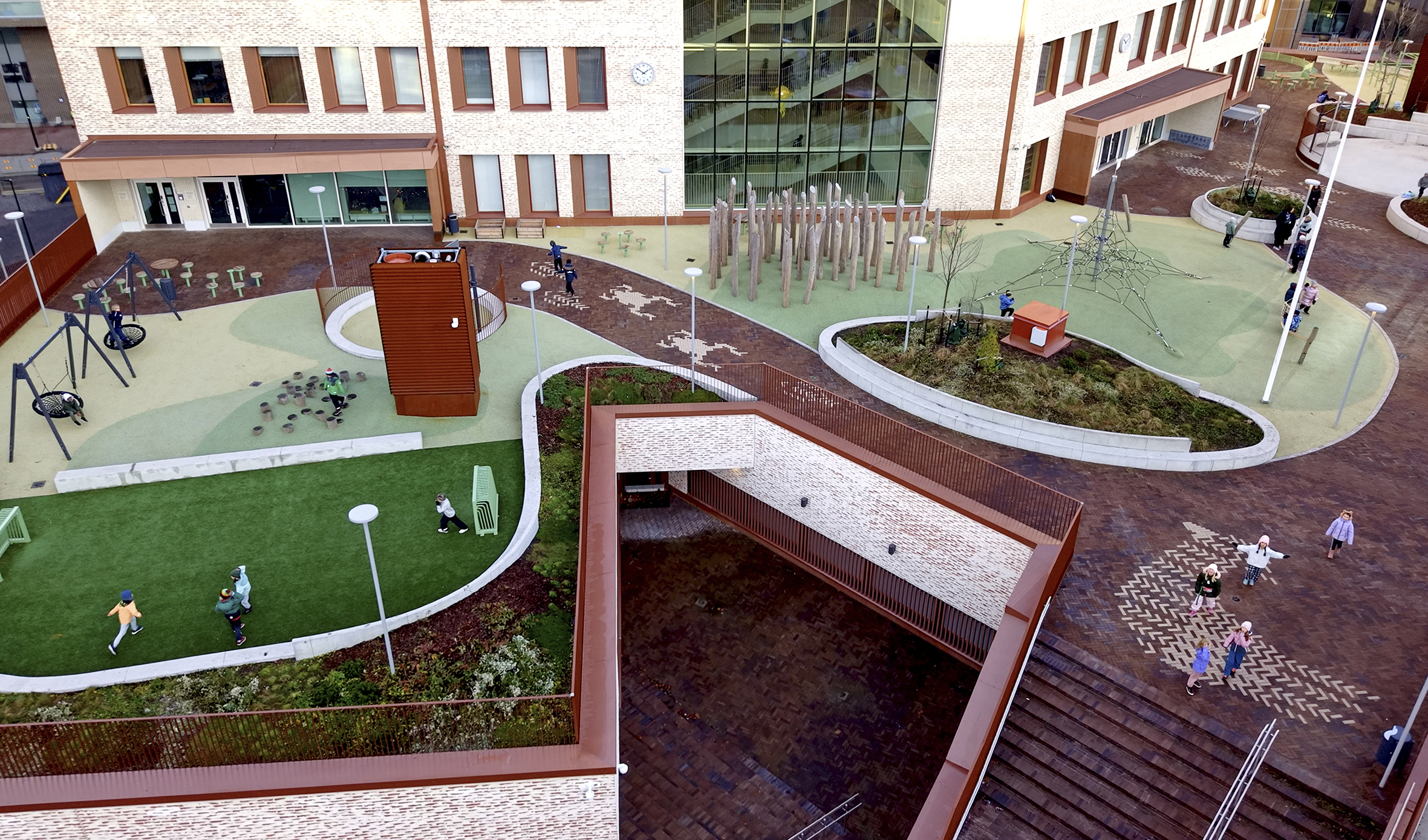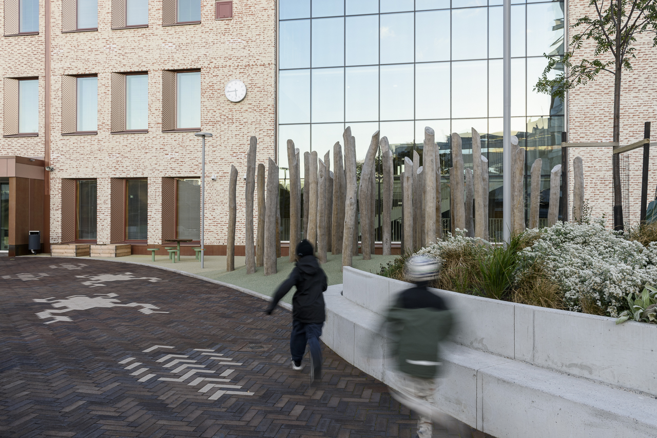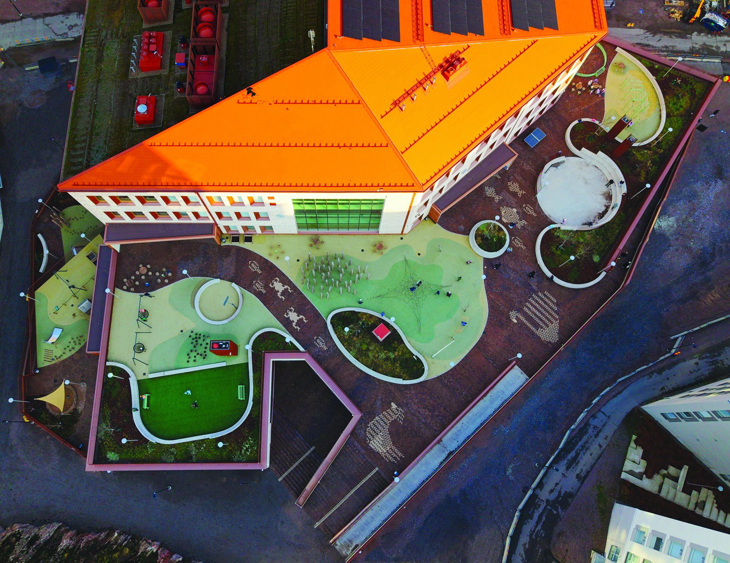 Pihat on sijoitettu pääosin rakennuksen matalan osan kattoalueille, johon on tuotu kasvillisuutta ja erilaisia oppimis- ja leikkipaikkoja. Päiväkodin piha sijaitsee omalla alueellaan. Novenberg toimitti pihojen katemateriaaliksi merkittävän määrän maatiiliä, joista suuri osa on kauniin punertavan sävyistä Gotland-maatiiltä. Vaalean sävyisellä Colima-maatiilellä toteutettiin hauskoja eläinhahmoja MASU Planningin suunnitelmien mukaan. Ulkoalueiden yhtenäistä ilmettä lisää maatiilien käyttö myös portaiden rakennusmateriaalina. Pihalta löytyy lisäksi pieni määrä Söndervig-maatiiltä, joten Pasilan kohteessa voi tutustua kolmeen eri maatiilituotteeseen.