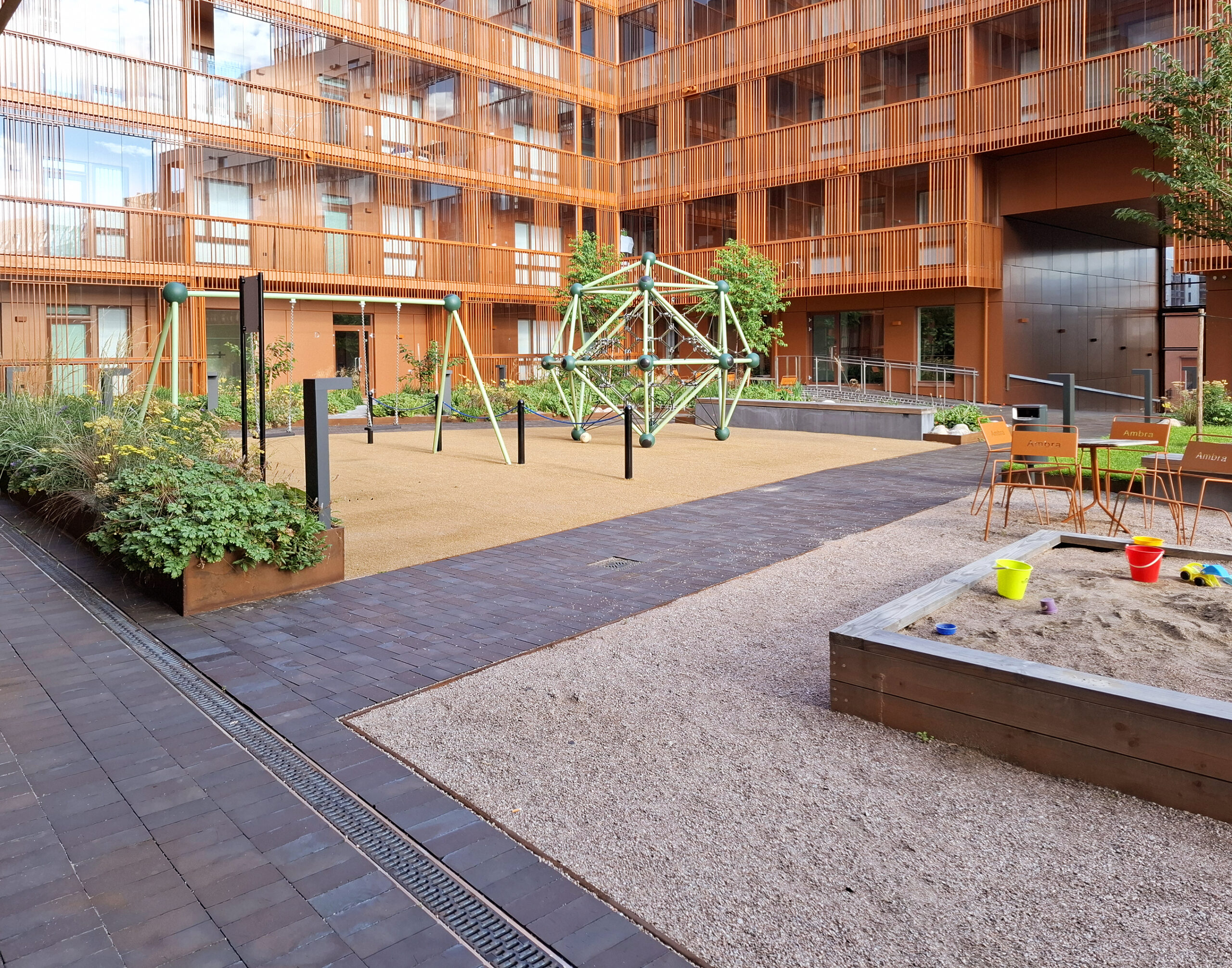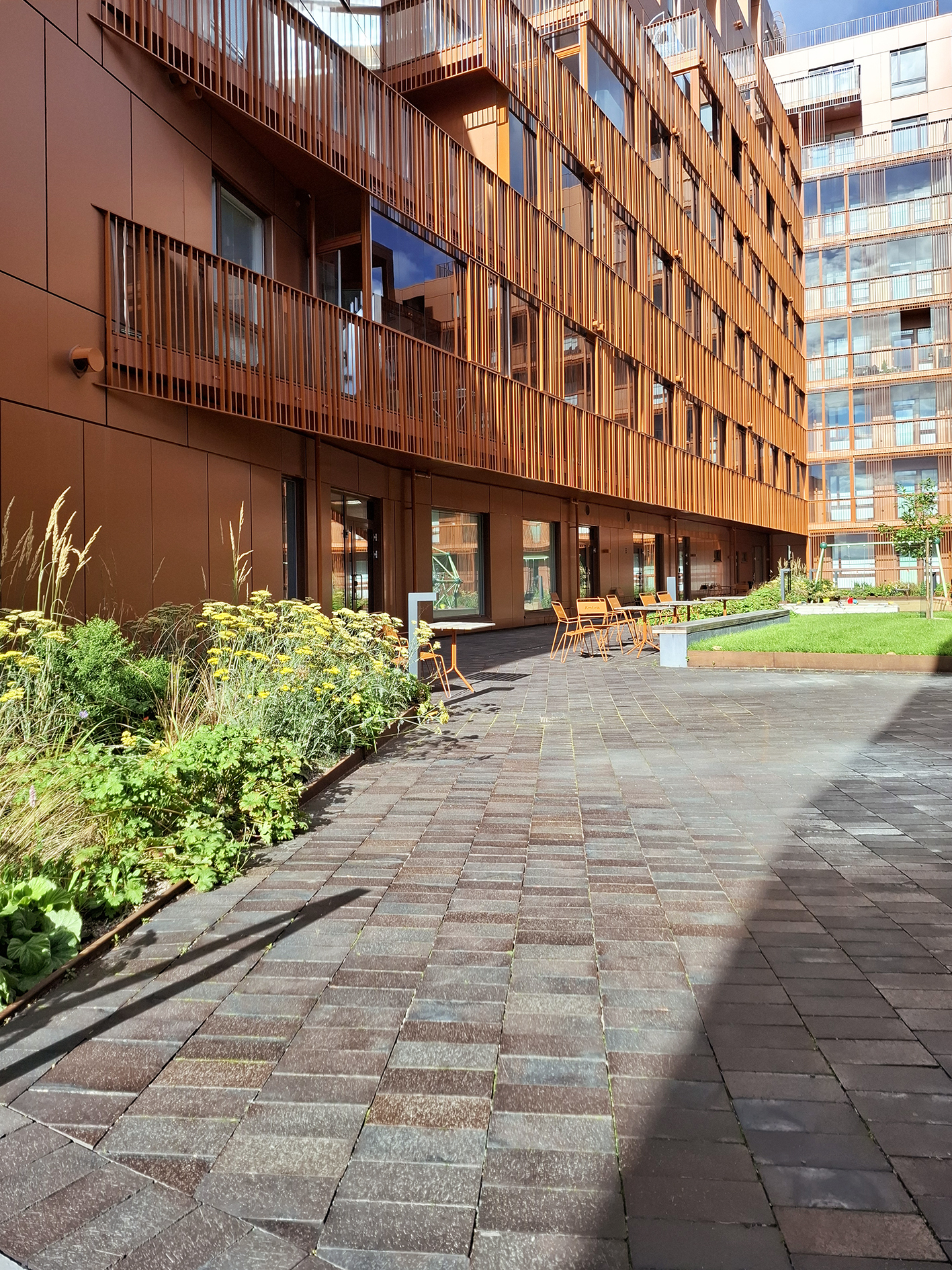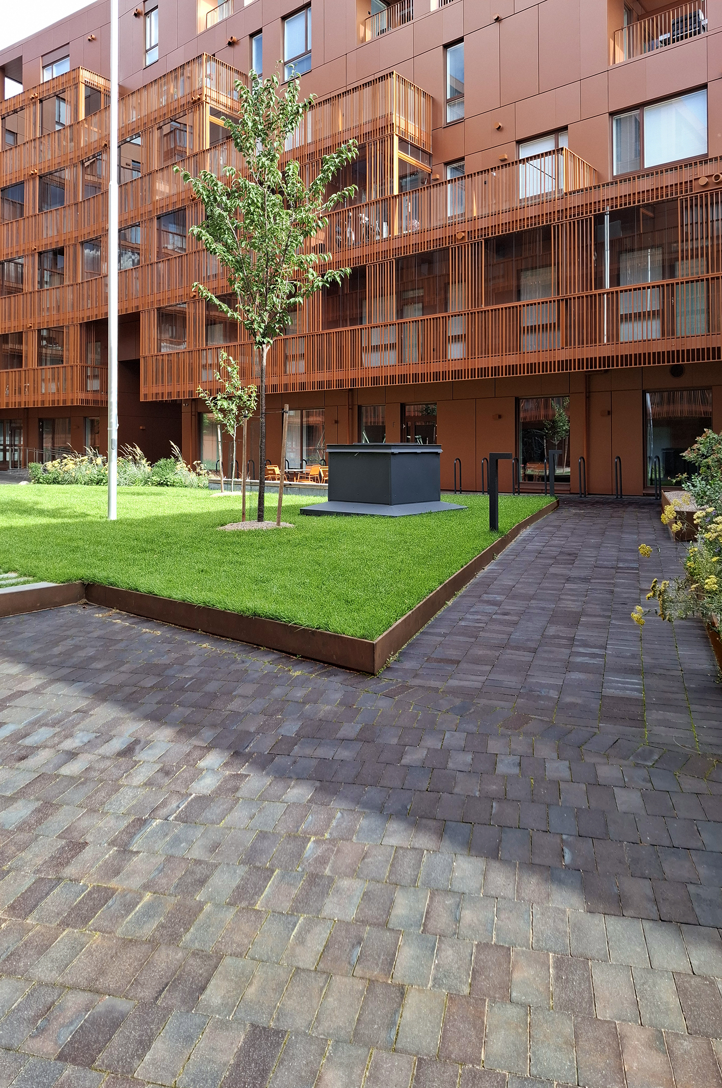 Taloyhtiön piha-alueiden katemateriaaliksi valittiin Suomen vaihtelevia sääoloja erinomaisesti kestävä maatiili. Maatiili on korkeapolttoinen keraaminen pihakivi, joka on valmistettu puhtaasti luonnon raaka-aineista. Vaihtelevat ladonnat ja hiilipoltetun Manchester maatiilen elävä sävy tuovat pihaan ilmettä myös harmaampina vuodenaikoina.