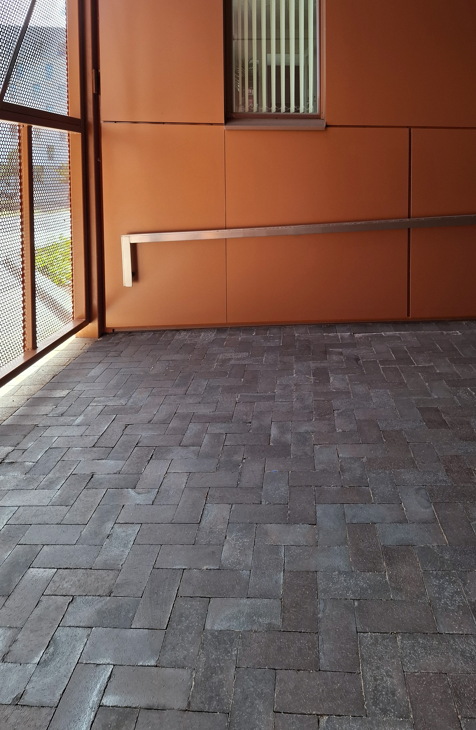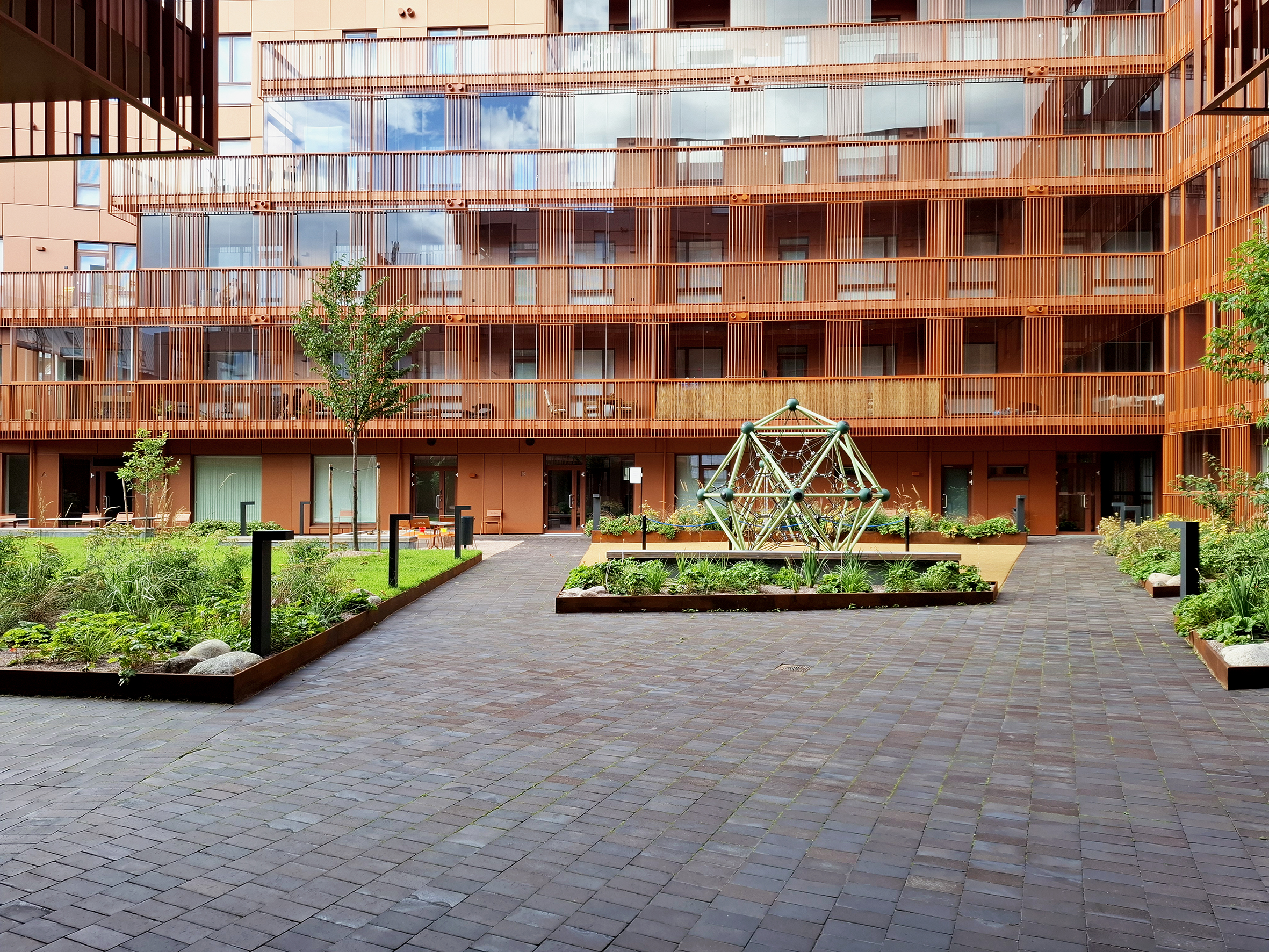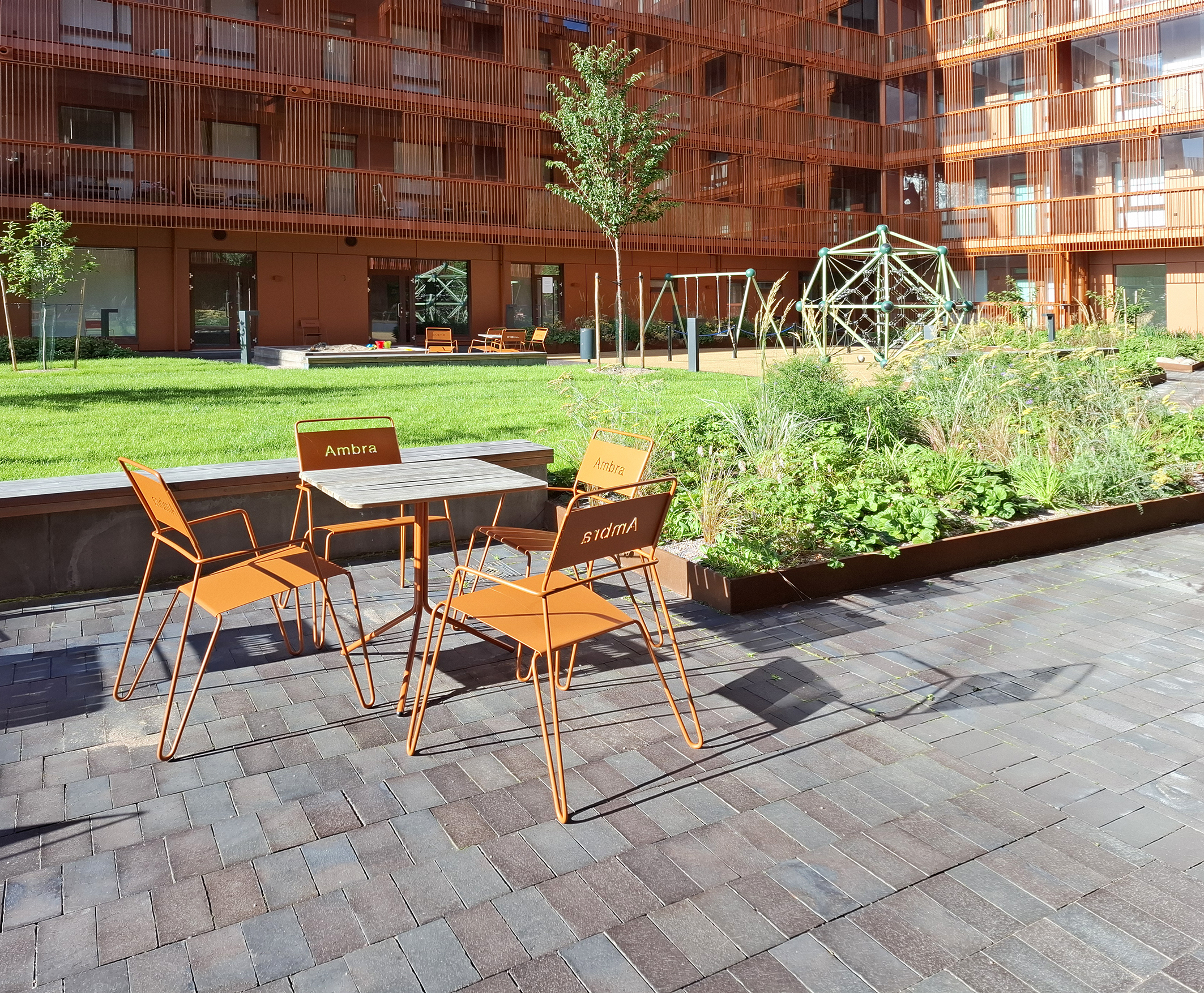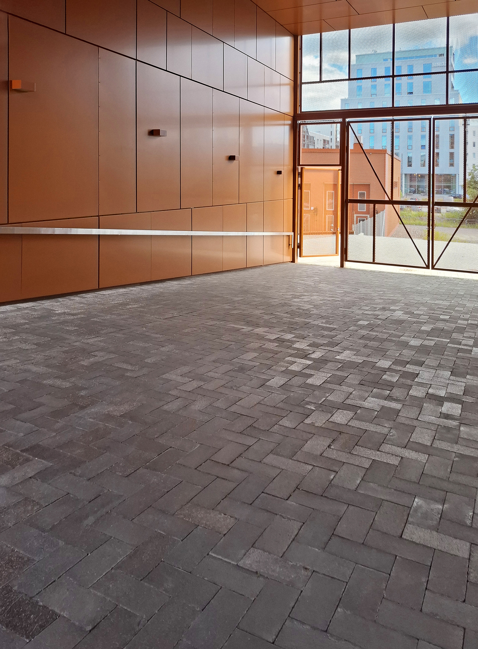 Taloyhtiön piha-alueiden katemateriaaliksi valittiin Suomen vaihtelevia sääoloja erinomaisesti kestävä maatiili. Maatiili on korkeapolttoinen keraaminen pihakivi, joka on valmistettu puhtaasti luonnon raaka-aineista. Vaihtelevat ladonnat ja hiilipoltetun Manchester maatiilen elävä sävy tuovat pihaan ilmettä myös harmaampina vuodenaikoina.