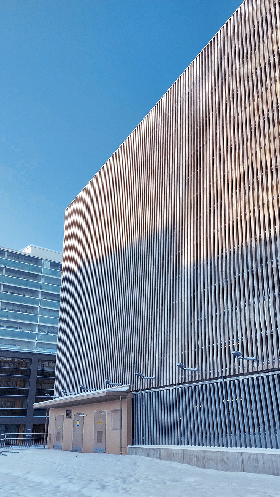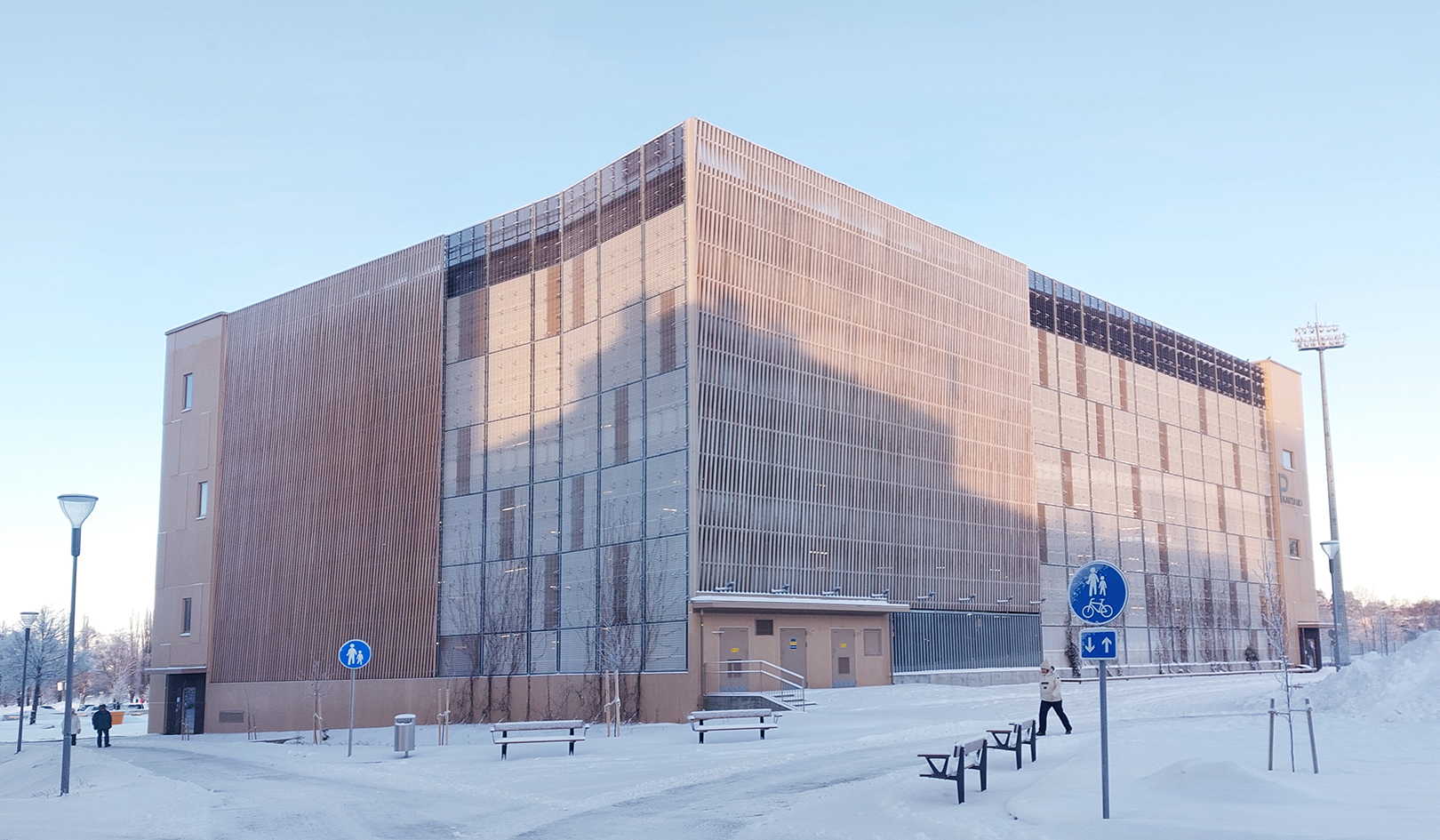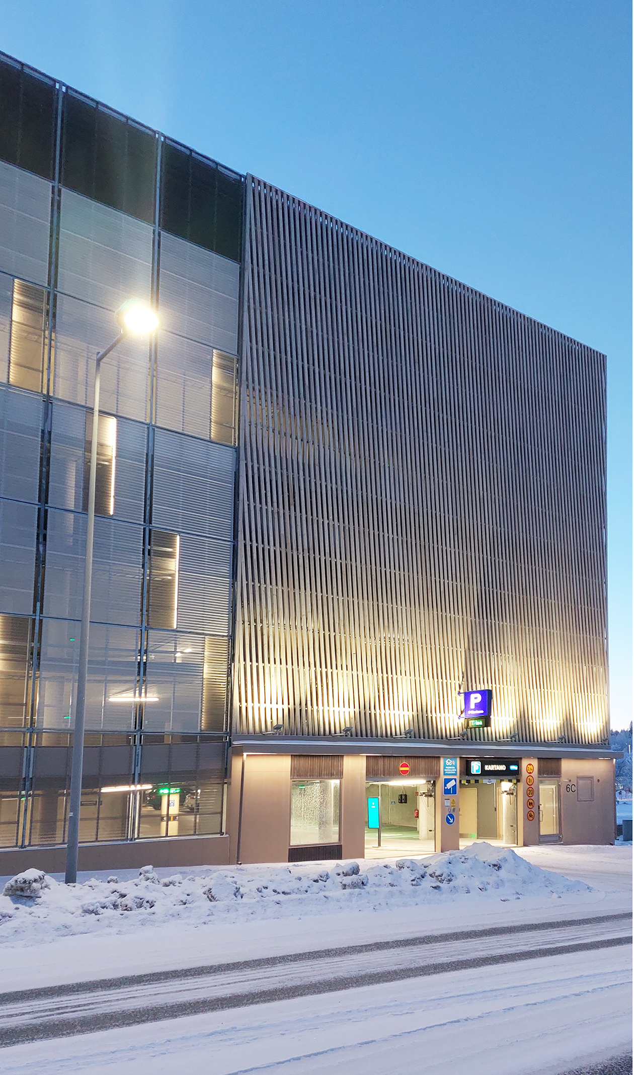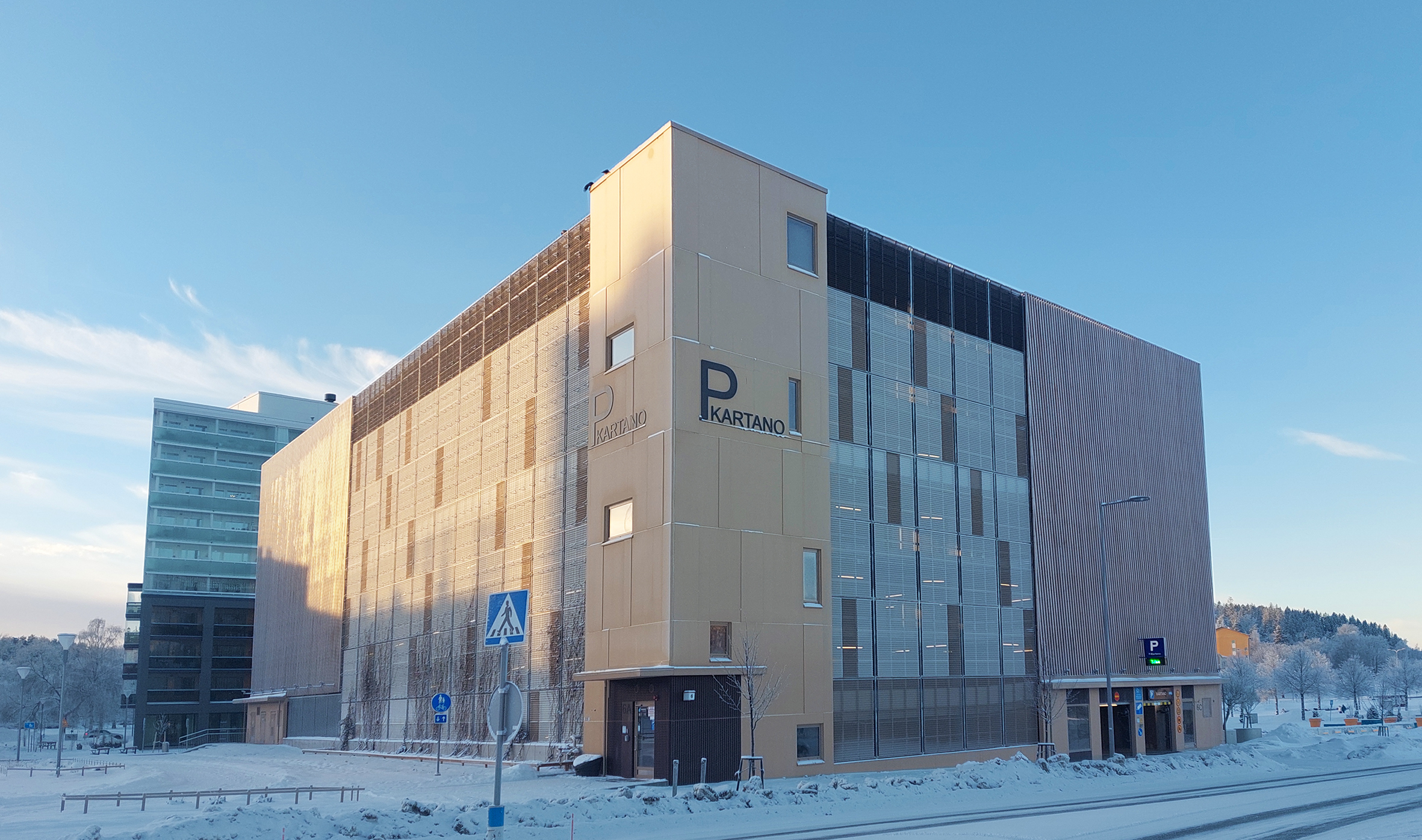 P-Kartanon pysäköintitalo sijaitsee kaupungissa keskeisellä paikalla palvellen alueen asukkaita sekä vierailijoita. Pysäköintitalon julkisivut on rakennettu Novenbergin toimittamasta palonsuojakäsitellystä männystä 45×95 mm, köynnösverkosta sekä maalatusta betonista. Puujulkisivu on toteutettu taiteilija Pauli Ahopellon moiré-efektiin perustuvana teoksena, joka valaistaan iltaisin. Taustalla olevalla systeemiseinällä on iltaisin taidevalaistus. Vesijärven puoleiseen 1 000 neliön betoniseinään ovat taiteilijat Heidi Katajamäki ja Veera Inkeri toteuttaneet värikkään seinämaalauksen. Muraali on saanut kuva-aiheensa ja värinsä lähiympäristöstä, erityisesti läheisen Pikku-Vesijärven maisemista. Pysäköintilaitoksessa on 7 kerrosta ja yhteensä 440 autopaikkaa. Käyttösähkönsä rakennus saa pääosin omasta 58 kW:n aurinkovoimalastaan – rakennuksen viherkatolla on yhteensä 140 aurinkopaneelia.