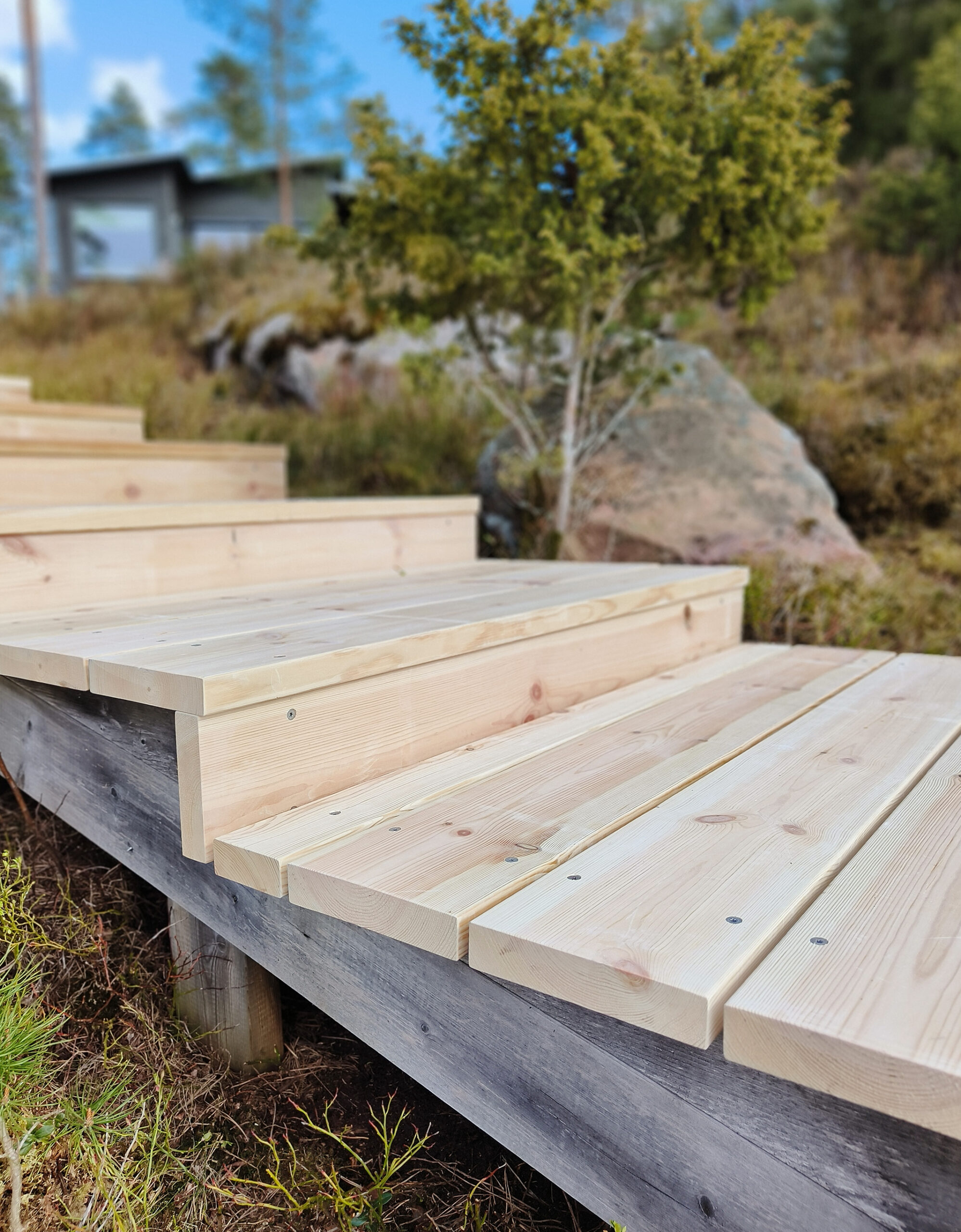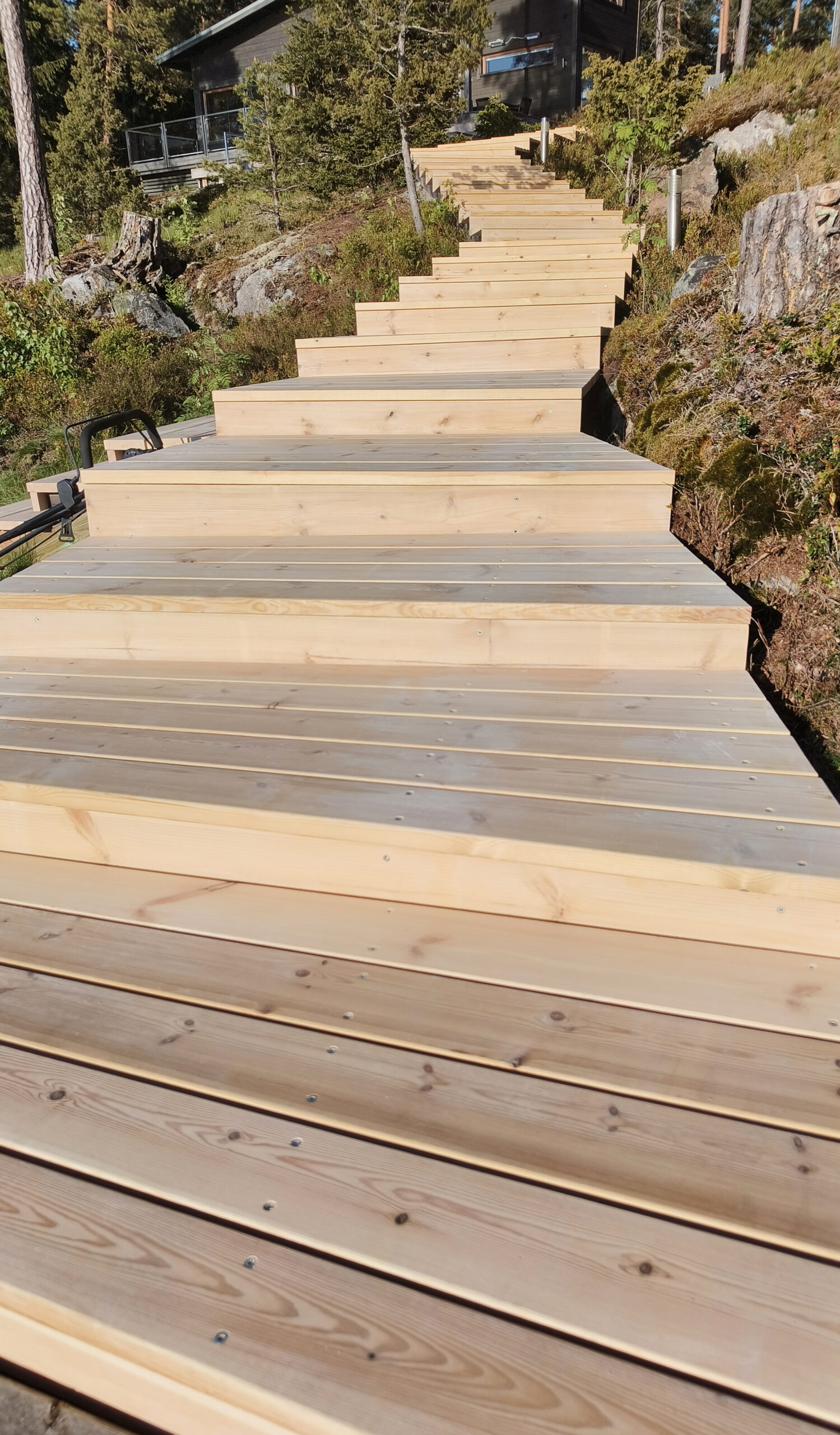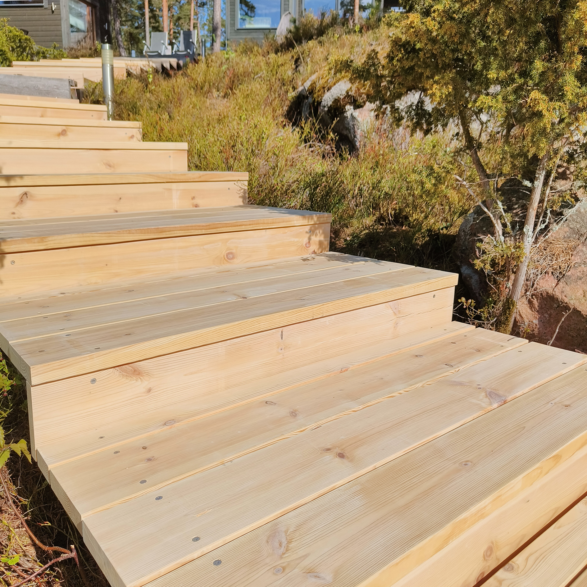 Beark rakentaminen toteutti merenrannan maastoon upeat puuportaat 35×180 mm Sature mäntylankusta. Sature on tuotemerkki myrkyttömästi ja ekologisesti silikaatilla (maaperän mineraalit) käsitellylle pohjoisen männylle. Sature-käsitelty puu ei kaipaa erillistä pintakäsittelyä, vaan puu harmaantuu nopeasti hyvin vaalean harmaaksi. Parhaan kestävyyden saavuttamiseksi tulee lautojen katkaisupinnat käsitellä rakentamisen yhteydessä Sature Preserve suoja-aineella. Sature puupintojen pesuun on myös tarjolla oma tuotesarjansa. Lue tuotteesta: https://novenberg.fi/sature/