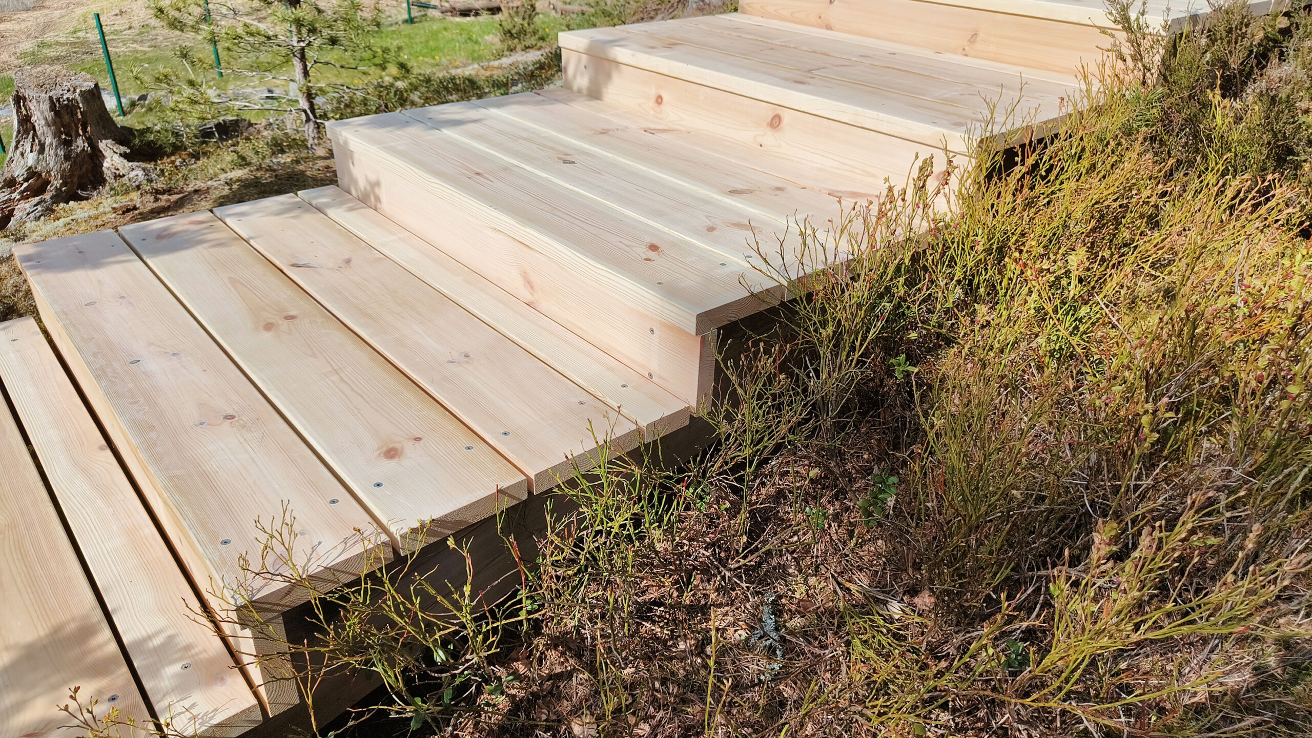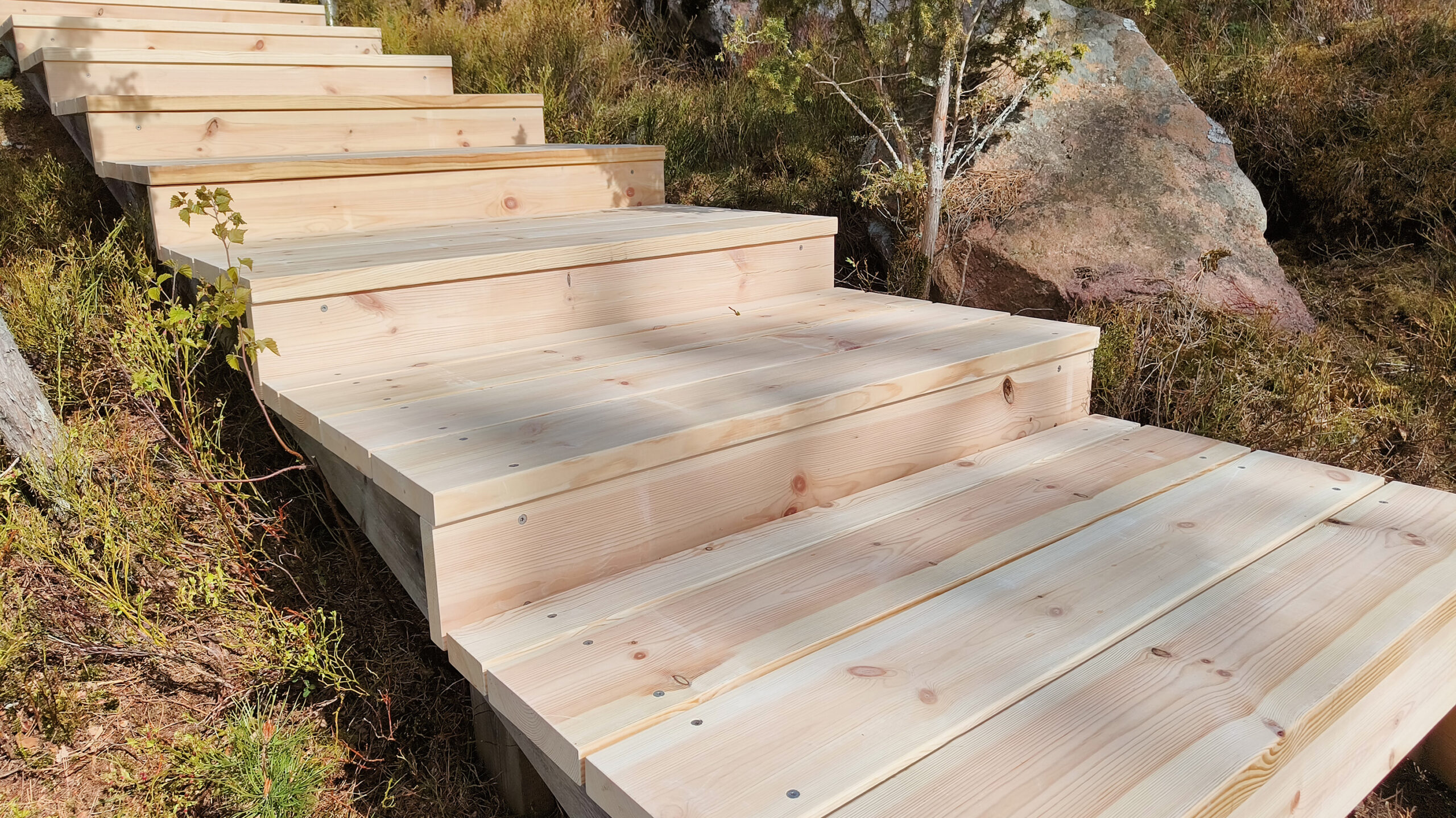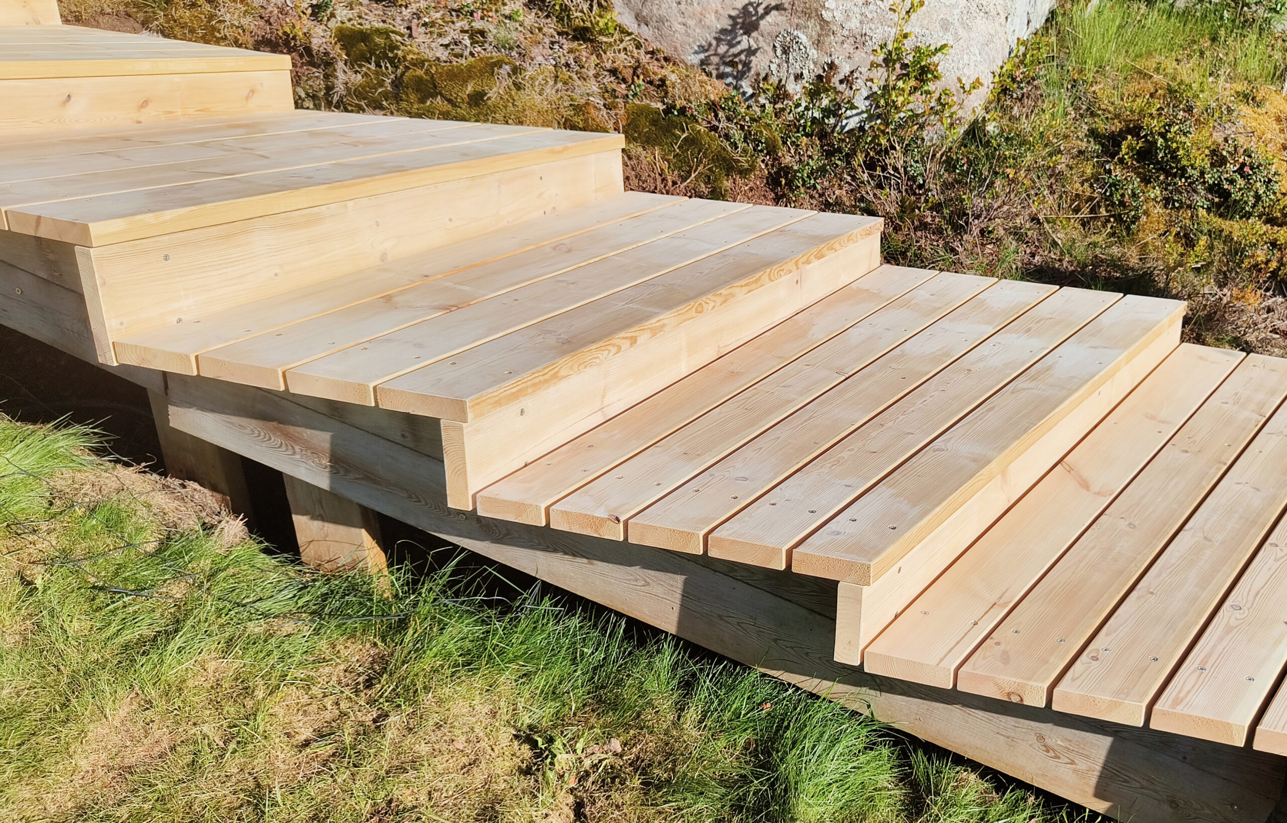 Beark rakentaminen toteutti merenrannan maastoon upeat puuportaat 35×180 mm Sature mäntylankusta. Sature on tuotemerkki myrkyttömästi ja ekologisesti silikaatilla (maaperän mineraalit) käsitellylle pohjoisen männylle. Sature-käsitelty puu ei kaipaa erillistä pintakäsittelyä, vaan puu harmaantuu nopeasti hyvin vaalean harmaaksi. Parhaan kestävyyden saavuttamiseksi tulee lautojen katkaisupinnat käsitellä rakentamisen yhteydessä Sature Preserve suoja-aineella. Sature puupintojen pesuun on myös tarjolla oma tuotesarjansa. Lue tuotteesta: https://novenberg.fi/sature/