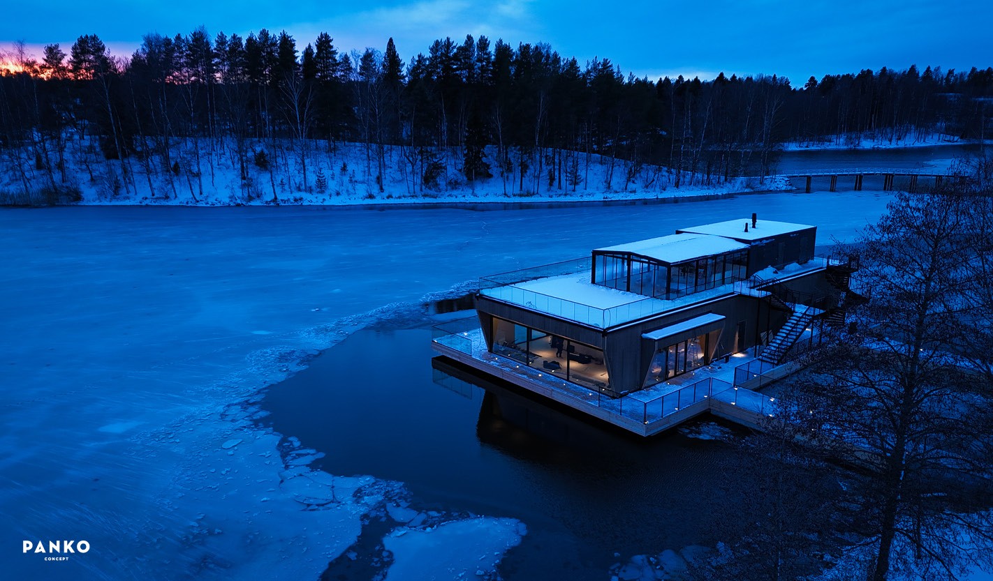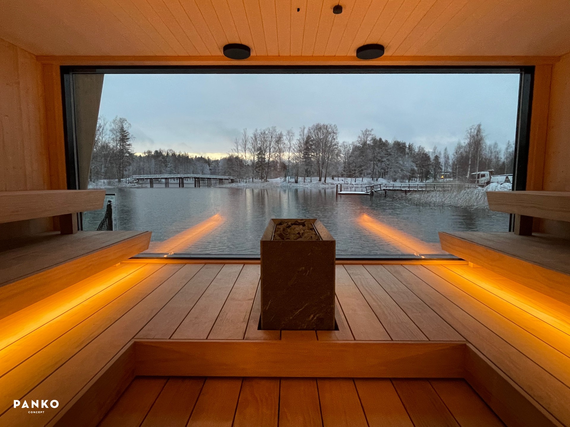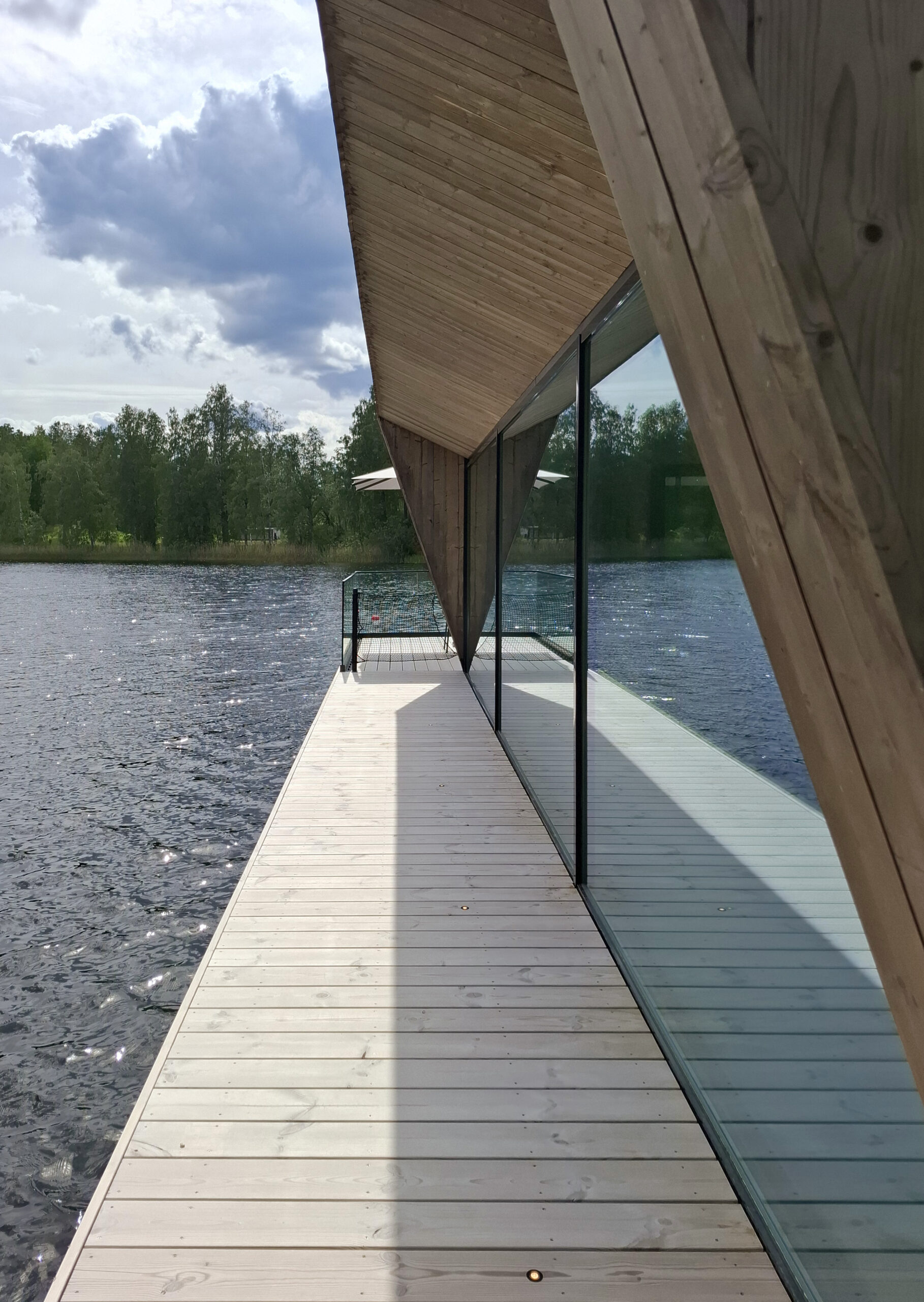Näyttävä kelluva kokonaisuus käsittää kaksi saunaa, ulkoaltaan, lounge-baarin sekä kesäisin upean kattoterassin. Saunan laudemateriaaliksi valikoitui Novenbergin Accoya sen erinomaisen kestävyyden ansiosta. Novenberg toimitti kohteeseen myös terassialueille Sature -tuotenimellä myytävää silikaattikäsiteltyä mäntyä ja äärimmäisen kestävää ja mittapysyvää Richlite -levymateriaalia hylly- ja tiskikalusteisiin.