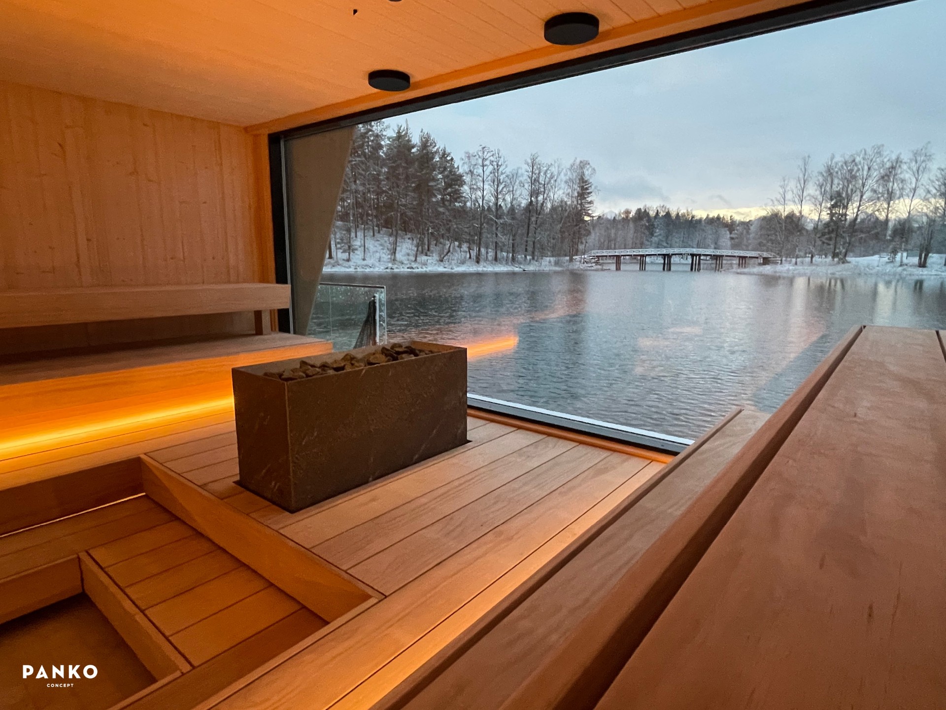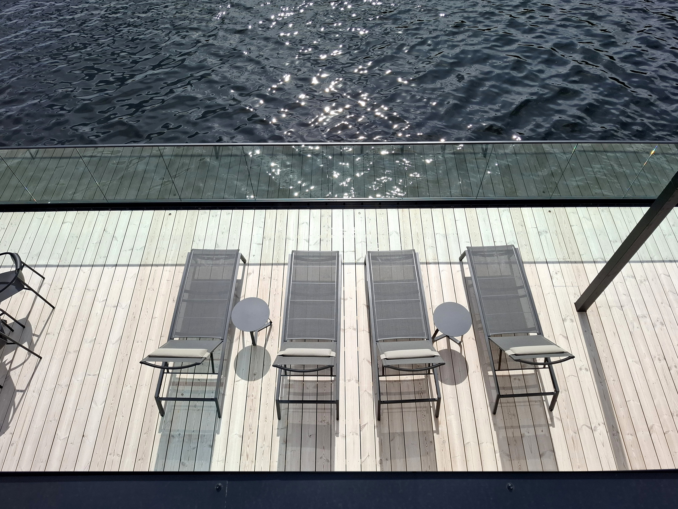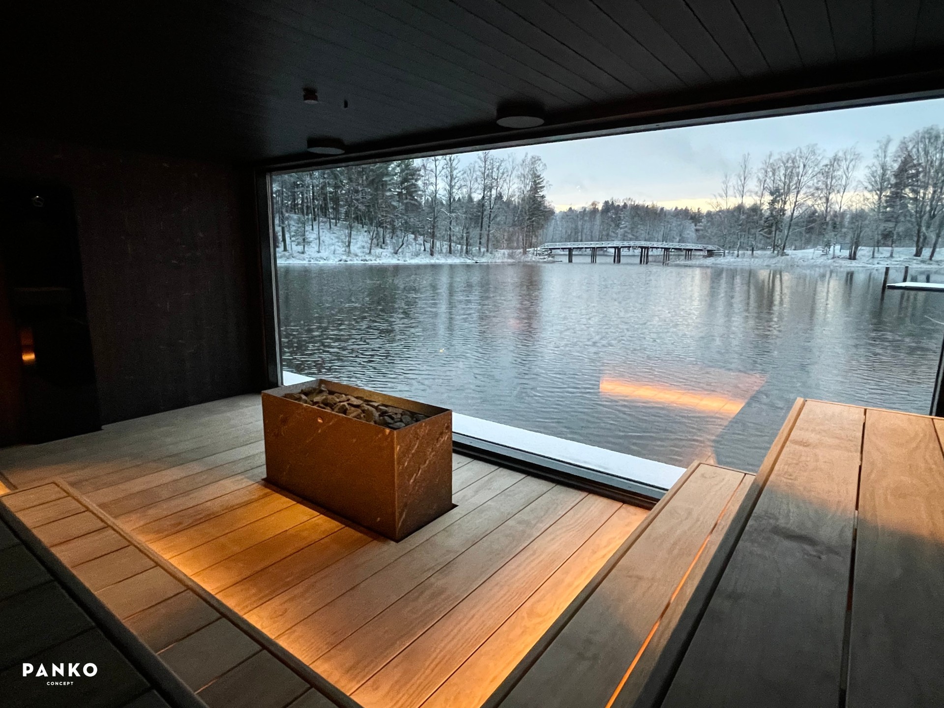 Näyttävä kelluva kokonaisuus käsittää kaksi saunaa, ulkoaltaan, lounge-baarin sekä kesäisin upean kattoterassin. Saunan laudemateriaaliksi valikoitui Novenbergin Accoya sen erinomaisen kestävyyden ansiosta. Novenberg toimitti kohteeseen myös terassialueille Sature -tuotenimellä myytävää silikaattikäsiteltyä mäntyä ja äärimmäisen kestävää ja mittapysyvää Richlite -levymateriaalia hylly- ja tiskikalusteisiin.